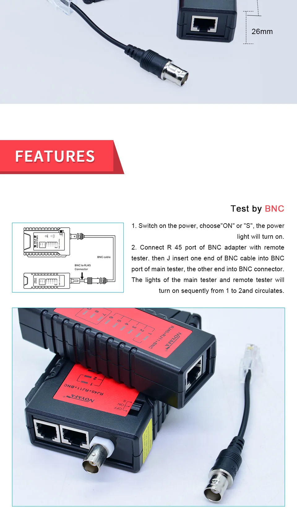 Основные украшения:1. Тест соответственно двойные витые кабели, телефонный кабель, коаксиальный кабель2. Способен определить неправильное соединение, короткое замыкание и Открыть Цепь3. Тестер кабеля для BNC, RJ11, RJ12, RJ45, cat 5E, cat 5 кабель4. Он может легко уточнить кабель, непрерывность, открытый и короткий5. Проверка непрерывности кабеля, открытая, короткая и поперечная Проводная пара до 1000 футов с удаленным наборомПреимущества:1. Видимый светодиодный дисплей состояния.2. Быстро проверьте кабель RJ11 и RJ45 и BNC.3. Автоматически запускает все тесты и проверки для непрерывной, открытой, короткой и перекрещенной пары проводов.4. Медленный и быстрый тестовый переключатель.Внимание:1. Не подключайте высоковольтные линии, чтобы избежать вырывания машины.2. Поместите в нужное место, чтобы не повредить других, из-за острых деталей.3. Подключите кабель к правому порту.4. Прочитайте руководство пользователя перед использованием.