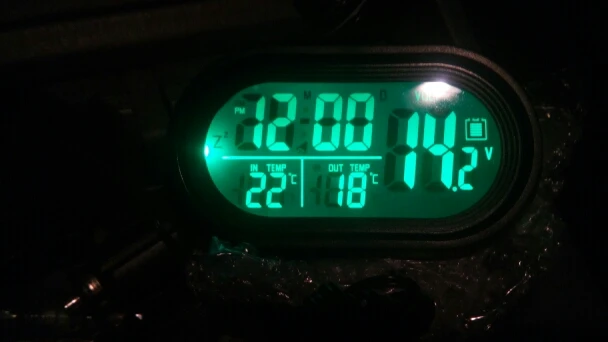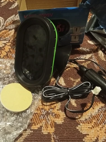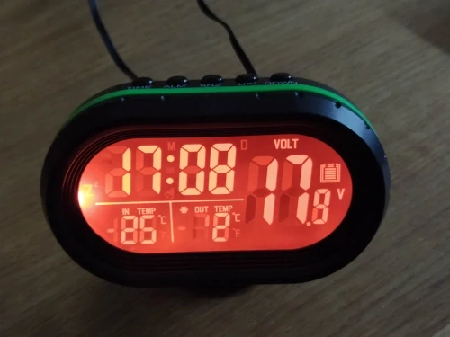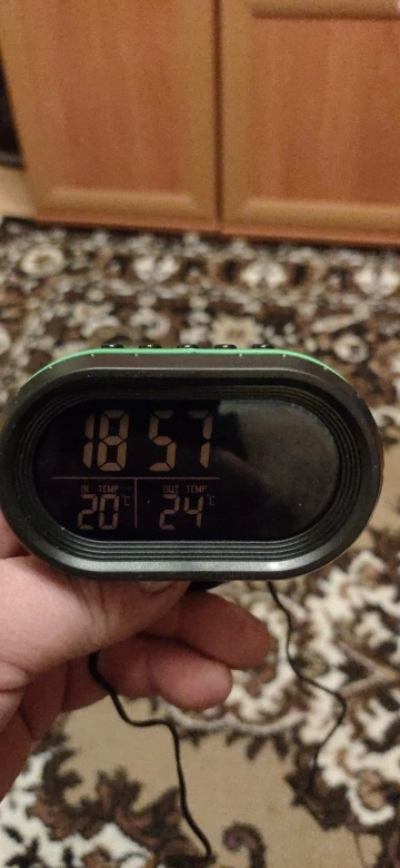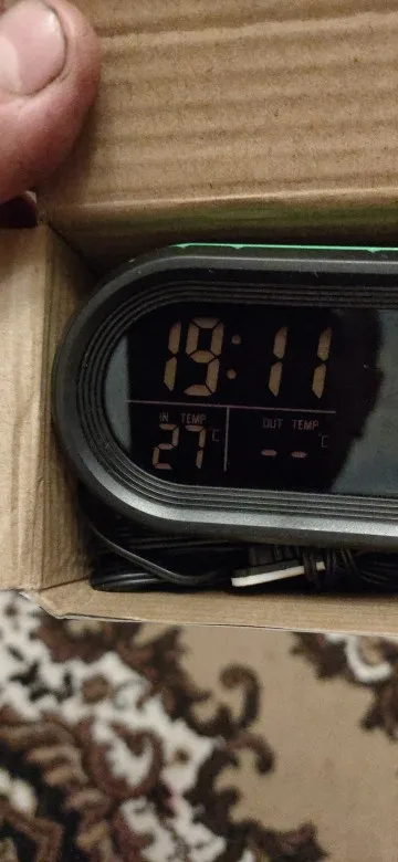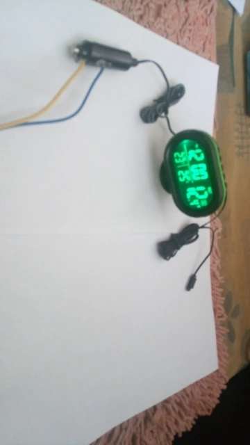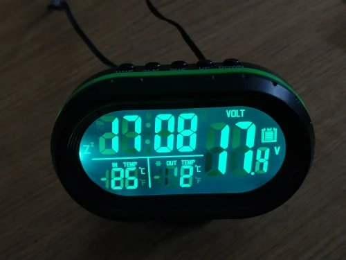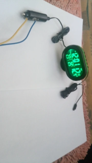 девайс работает, но крепить датчик внешней температуры на лобовое стекло изнутри(так показано на фото) фигня. Крепить нужно с улицы, а куда это уже дело каждого. Можно удленнить провод и под бампер поставить. При выборе цвета ошибся, посчитал, что это будет цвет табло, оказалось , что выбор цвета -это цвет полоски снаружи девайса, а табло можно включить и зеленым и красным. в Целом норм.