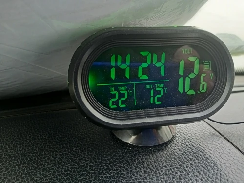 отправили из России на следующий день, доставка за 4 дня сдэком в Североморск. Точность измерения напряжения не замеряли. Выставляется дата и время (12 или 24 часовой формат) градусы цельсия или по Фаренгейту, подсветка меняется, красная или зелёная. Поставляется с батарейками, бортовая сеть для подсветки. С продавцом не общались.