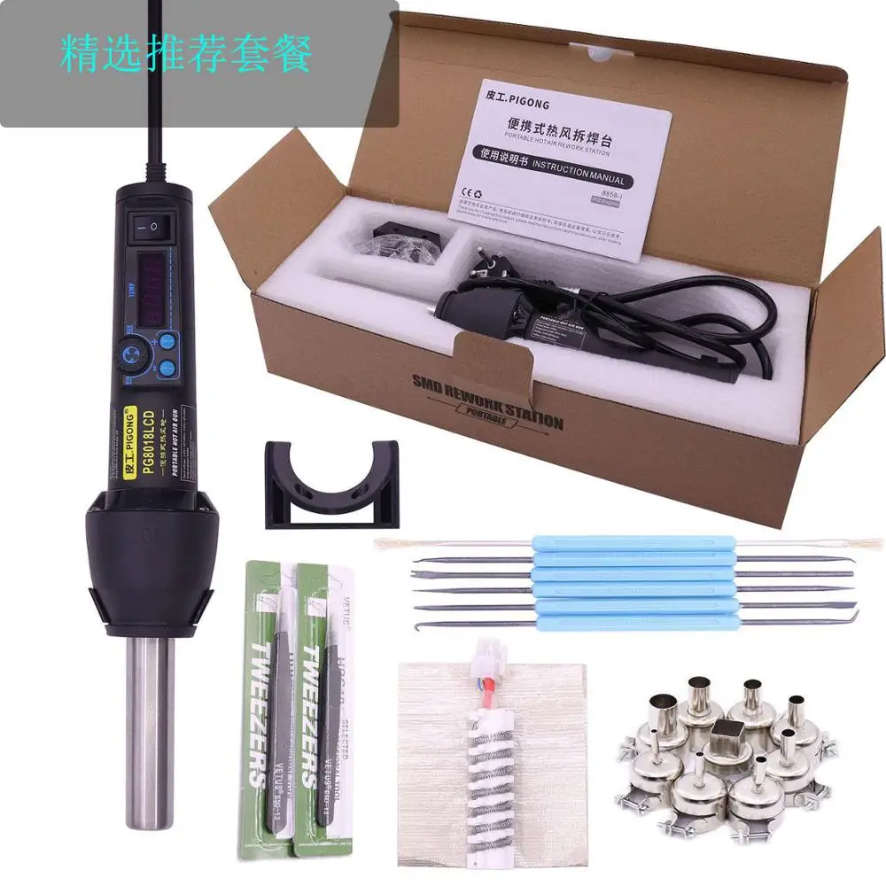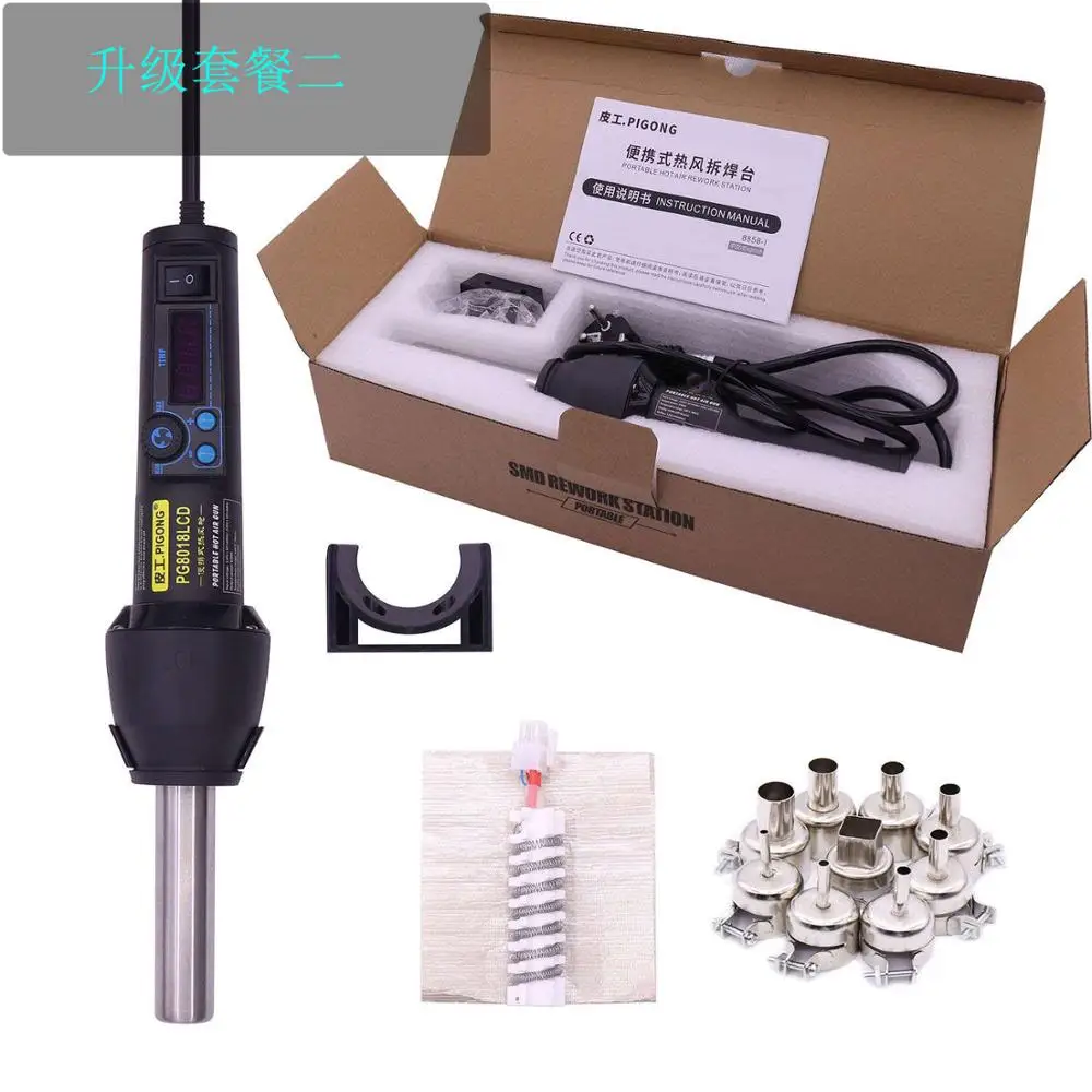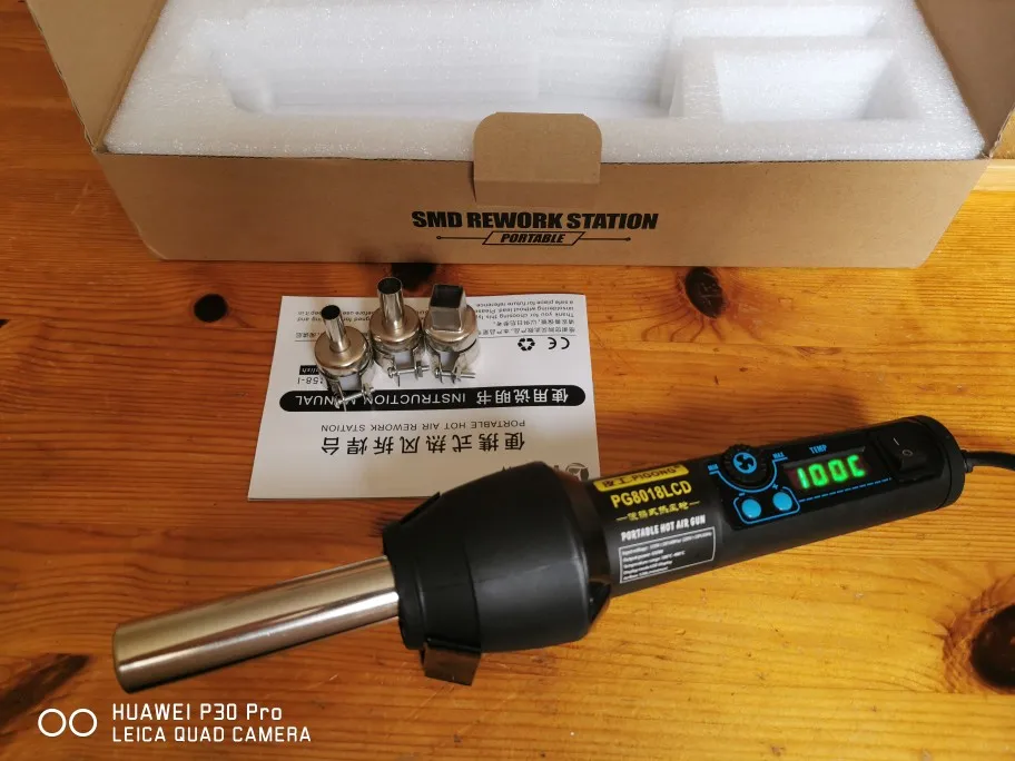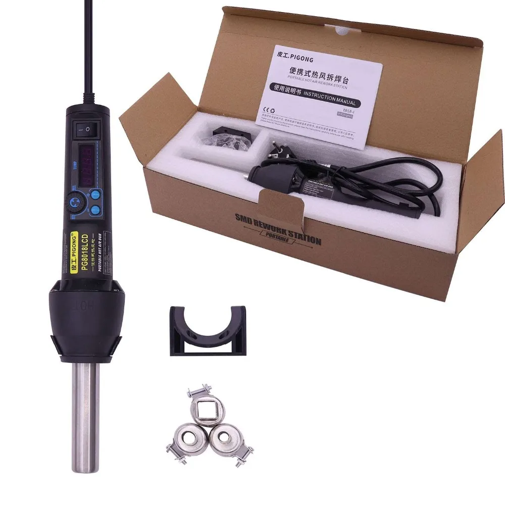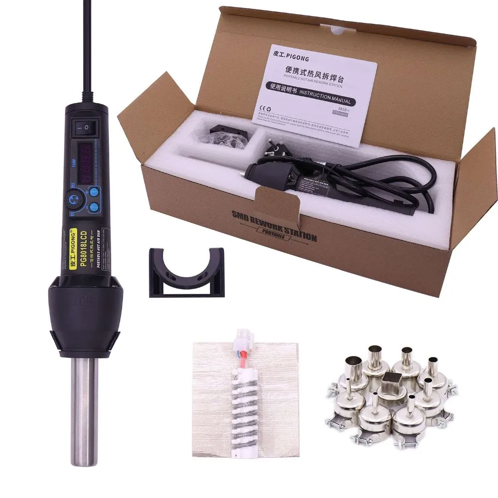 PG-версия 8018LCD горячего воздушного пистолета с этим просто регулируемым, стабильным и четким считыванием температуры работает действительно хорошо для небольшого ремонта SMD, смягчающие пластмассы и Усадочные трубки с пиком до 650 Вт и около 220 Вт непрерывно для максимальной температуры 480 градусов С. Действительно отлично!