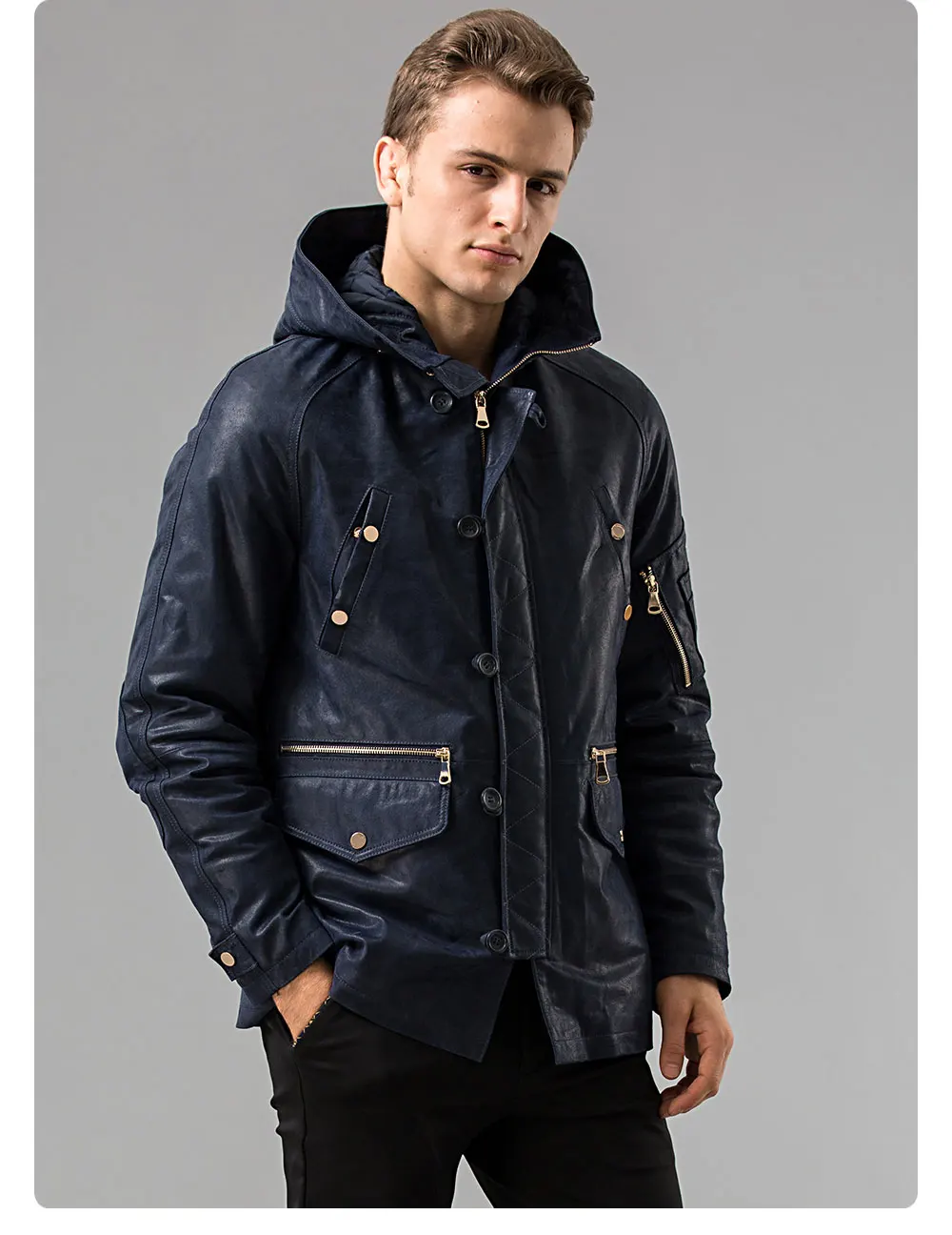 Kожаная куртка мужская теплое пальто с капюшоном, из свиной шкуры, ...