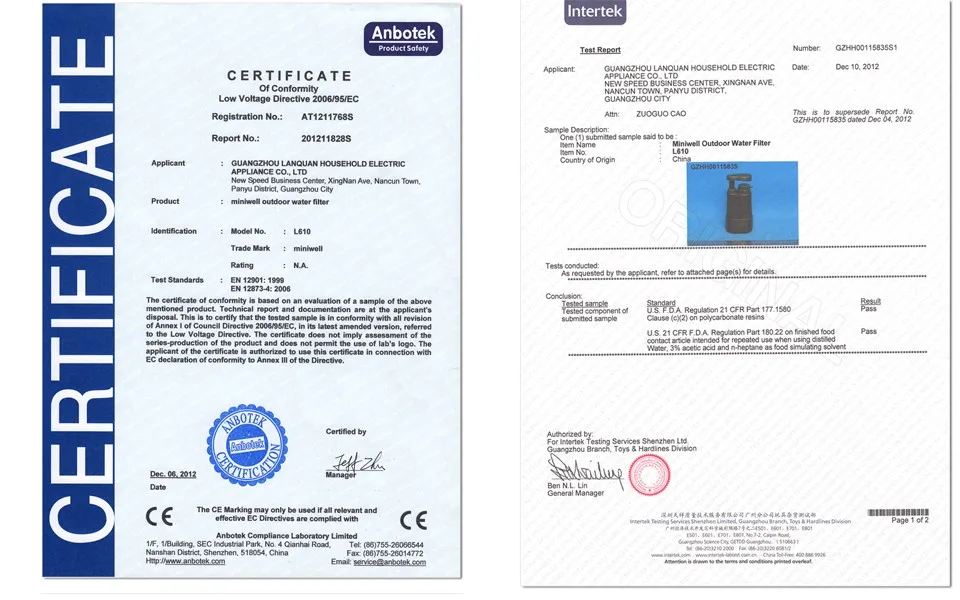 Miniwell L610 получил FDA, CE сертификаты и прошел через SGS отчет тестирования.