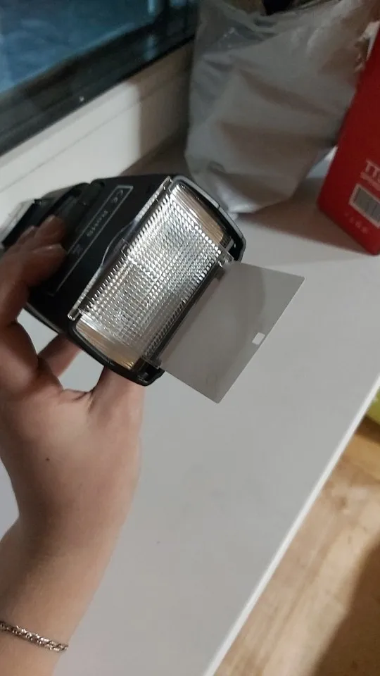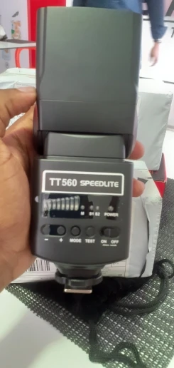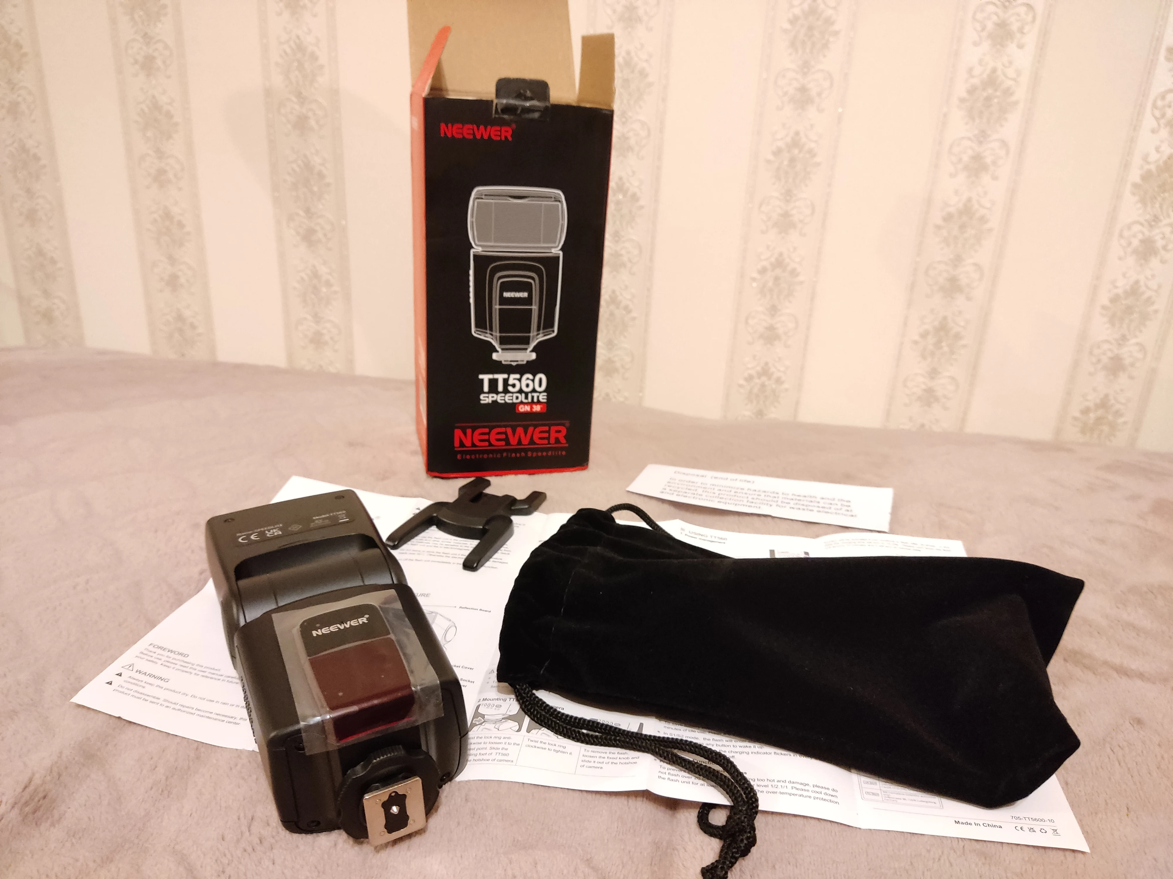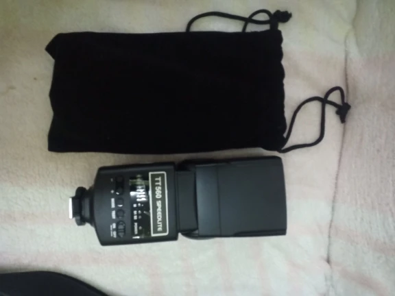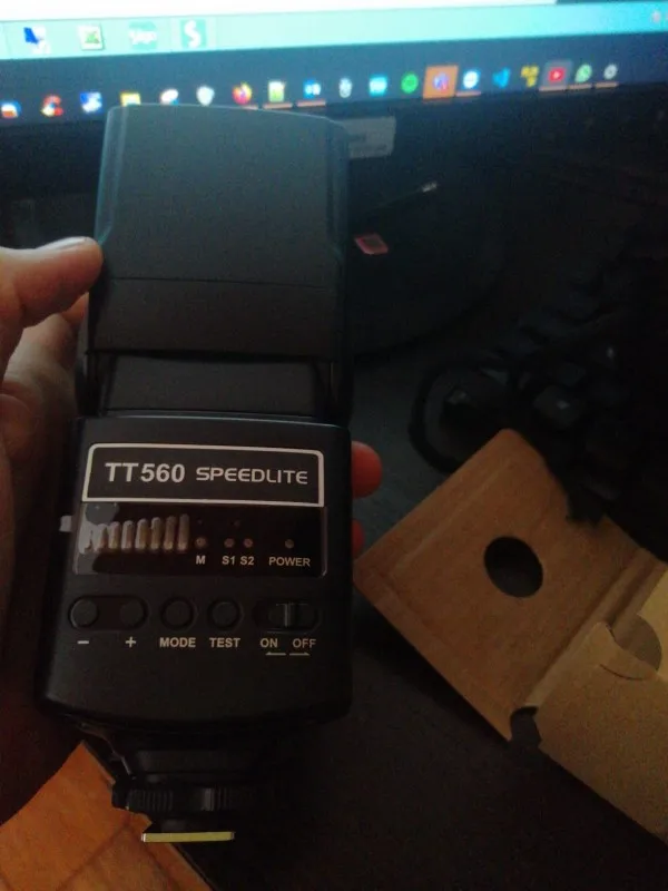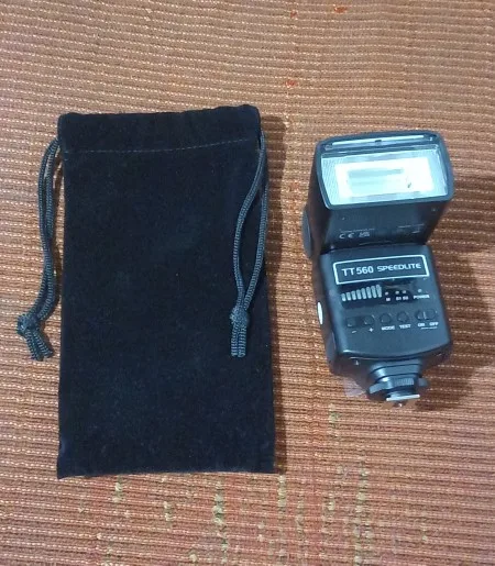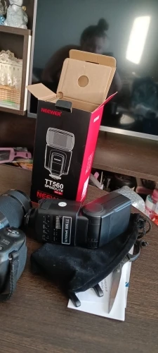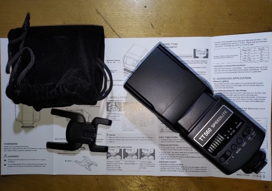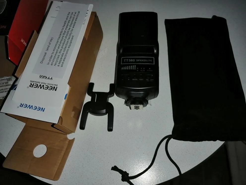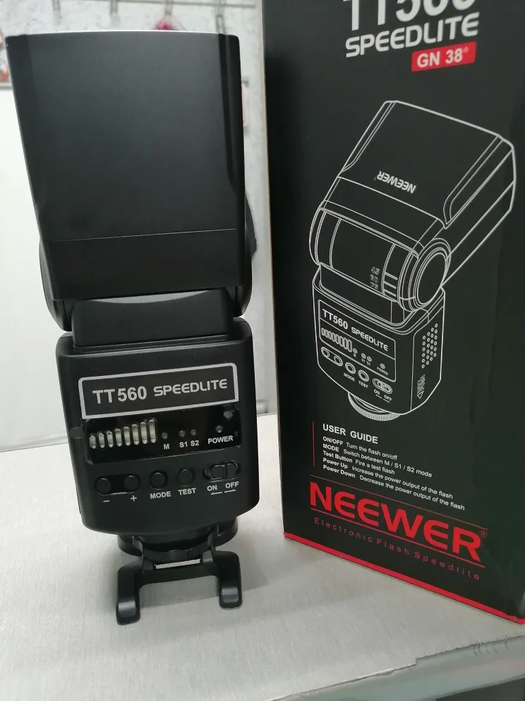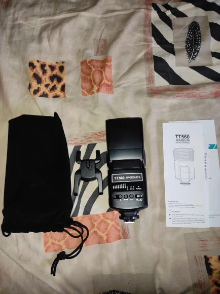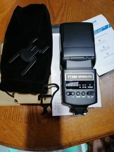 Посылка на минскую почту пришла относительно быстро - за 22 дня из Китая. На удивление даже упаковка была практически не повреждена. А внутри и вовсе хорошо была упакована, плюс в мешочке была. В комплекте ещё подставка и буклетик с инструкцией на английском языке. Сама вспышка весьма лёгкая. Но относительно размеров моей Canon 580EXII почти идентичная. Подошёл даже рассеиватель. По яркости также идентичны на минимальном и максимальном режимах, а может и чуть-чуть ярче TT560 (фото прилагаю)