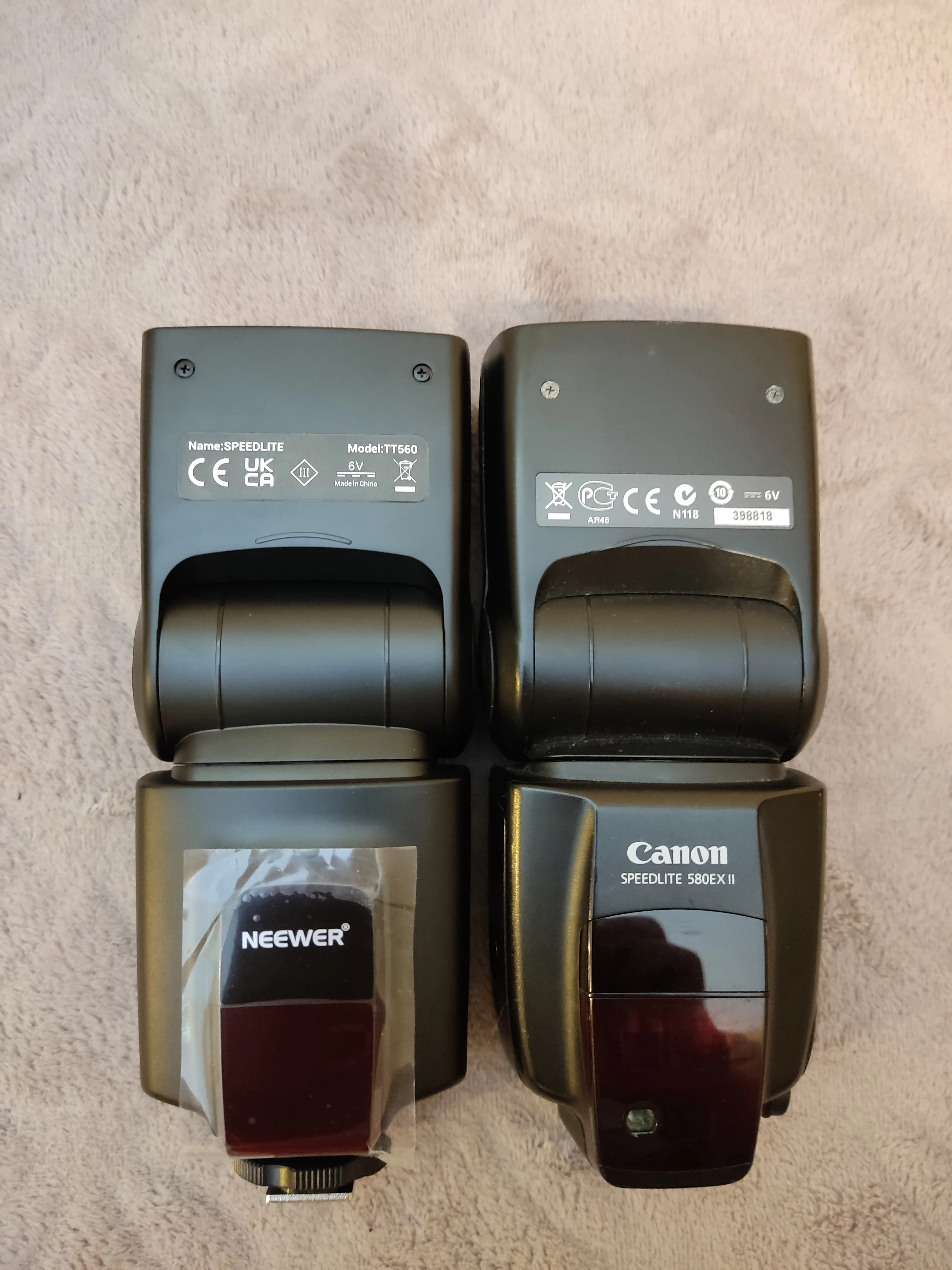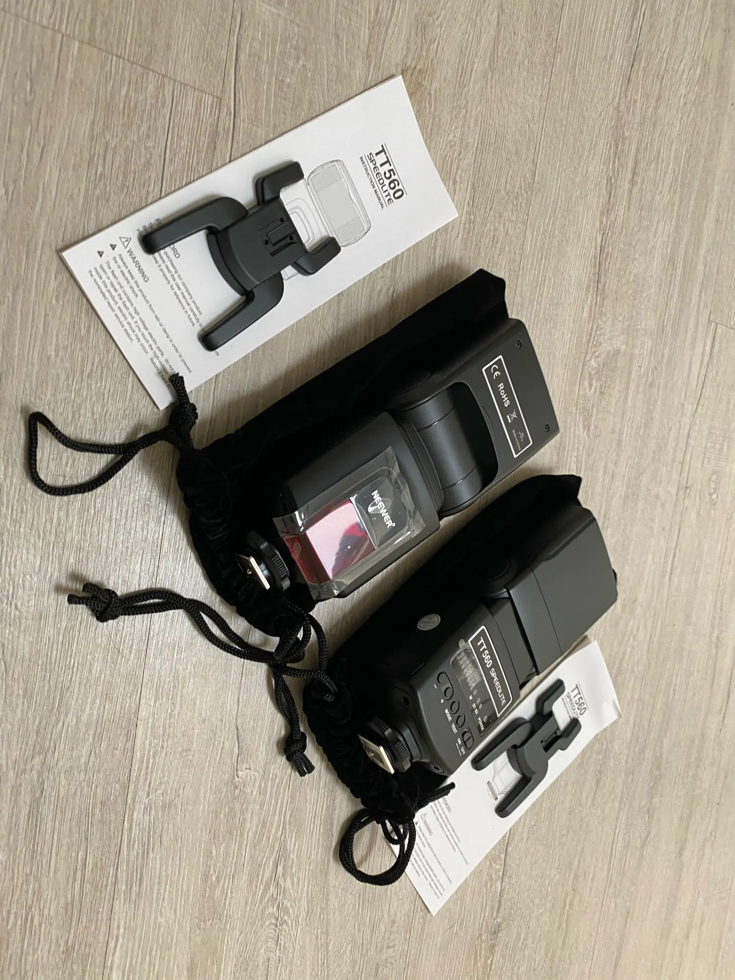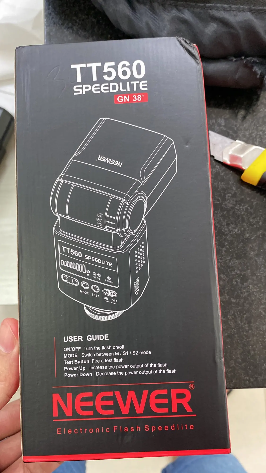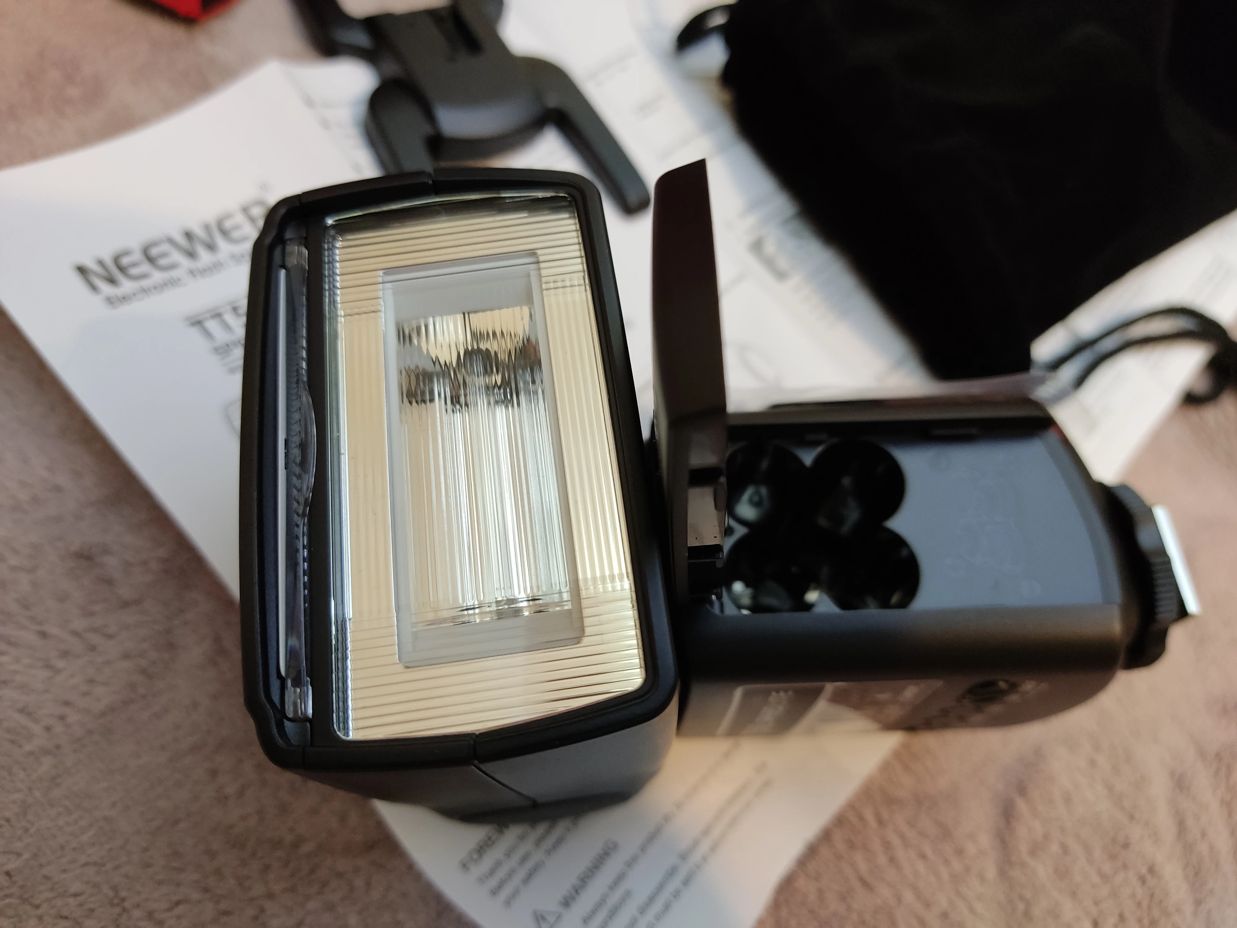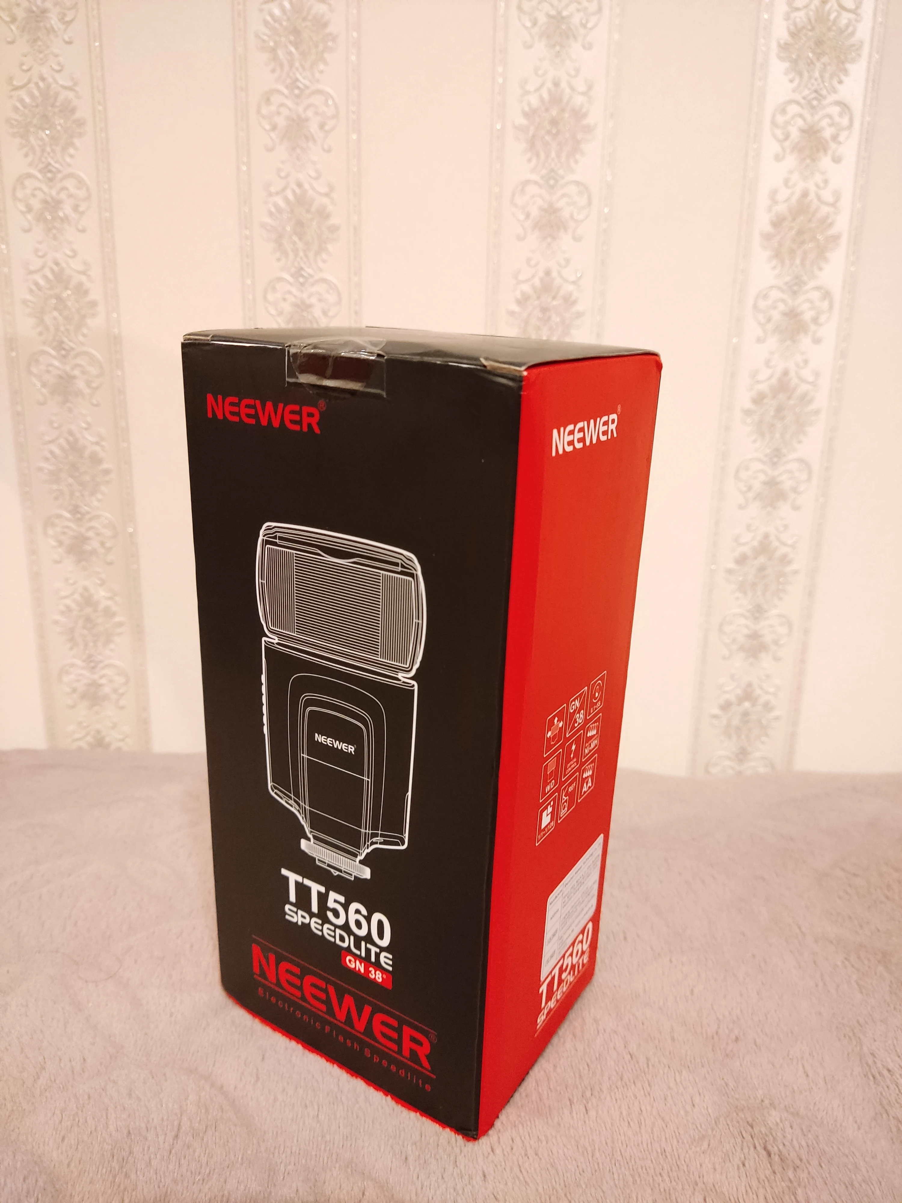 Посылка на минскую почту пришла относительно быстро - за 22 дня из Китая. На удивление даже упаковка была практически не повреждена. А внутри и вовсе хорошо была упакована, плюс в мешочке была. В комплекте ещё подставка и буклетик с инструкцией на английском языке. Сама вспышка весьма лёгкая. Но относительно размеров моей Canon 580EXII почти идентичная. Подошёл даже рассеиватель. По яркости также идентичны на минимальном и максимальном режимах, а может и чуть-чуть ярче TT560 (фото прилагаю)