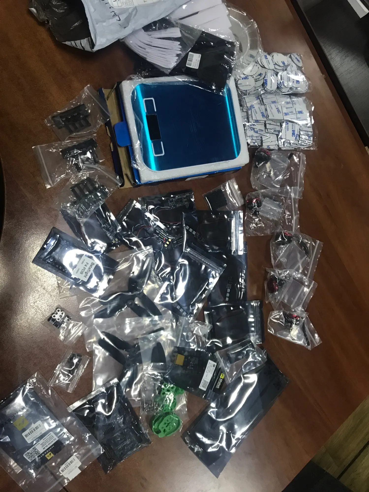 Пришло, но на этом радости закончились. В комплекте не хватает большей части винтов, те что есть (только для моторов) не подходят пт длине, первый рпз всё прикрутилось, отерутил, намазал герметиком резьбовым и на 3 из 4 моторов по 2 витка резьбы вырвал. Подобрал винты, съездил в магазин купил, собрал. Винты обошлись 400р. Всё спаял, соединил, включил, прошил, подключил аккумулятор чтобы проверить направление вращения моторов и один регулятор сразу же сгорел. Заменил в нем мосфеты, сгорел снова. Больше свободного времени нет, но очевидно брак на плате или оде то ещё, раз они сразу горят. Продавец не отвечает на спор и сообщения, но новые регуляторы придётся заказывать всё равно тут, потому что лучше нет. В комплекте были очень мягкие 2х лопастные винты dji. Рама хорошо подогнана и хорошо собирается, но с крепежом проблемы.