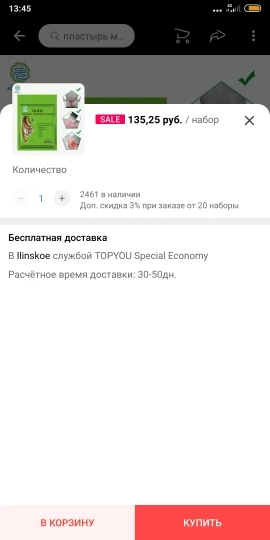 50 дней до Мордовии. Хотелось бы доставку побыстрее..... Заказываю здесь постоянно эти пластыри и неизменно превосходный результат.