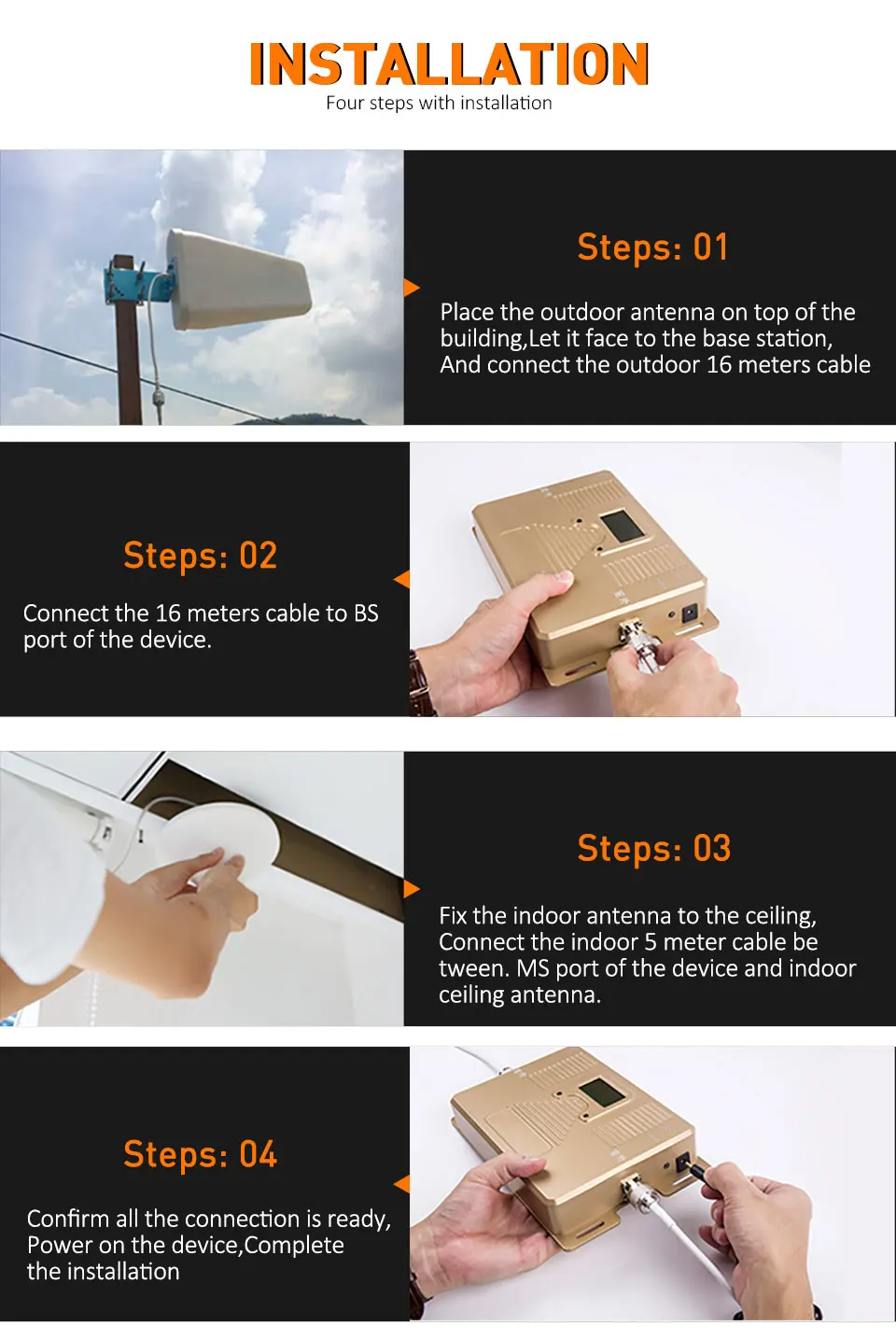 1. Получает сигналМощная антенна достигает доступа к хорошему сигналу и доставляет его к бустеру.2. Повышает сигналУсилитель получает сигнал, усиливает его и служит в качестве реле между вашим телефоном и ближайшей башней сотовой связи.3. Сигнал передачиВаши устройства получают увеличенный прием ячеек, а звонки и данные подаются через усилитель обратно в сеть.Примечание: Пожалуйста, убедитесь, что место, где вы собираетесь установить, с CDMA 850MHz,PCS 1900MHz сигнала. И убедитесь, что вы можете получить по крайней мере 2 бар 2G 3G сигнал на открытом воздухе перед покупкой, в противном случае этот продукт не может вам помочь. Для улучшения сигнала в помещении необходим хороший внешний сигнал.