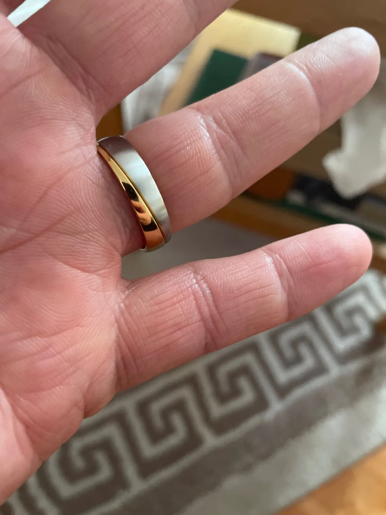 Идентичное описание кольца .. Пришло быстро. Крутой, потому что тяжелый. Я не знаю, сколько времени займет цвет, и быстро не выцветает. Но за эту цену у меня не очень большие ожидания. Я рад.