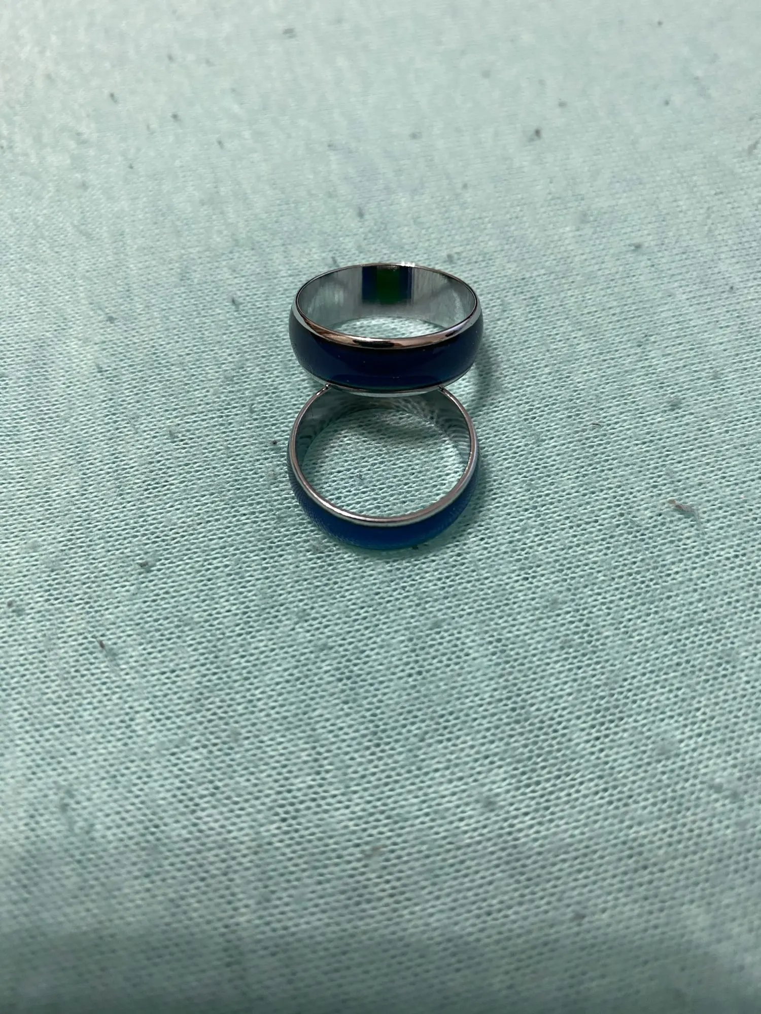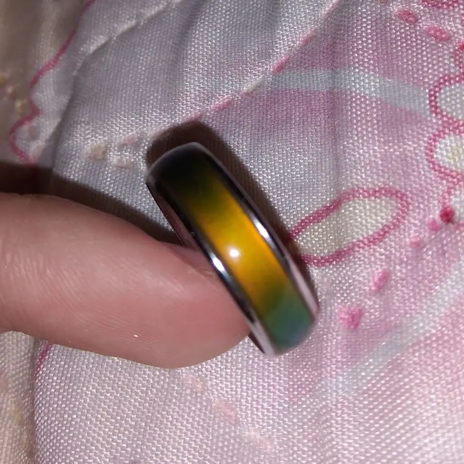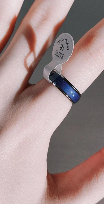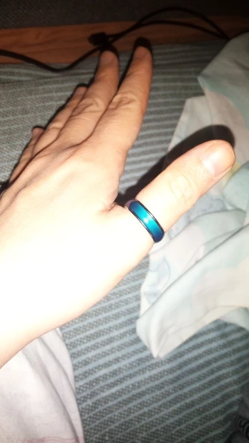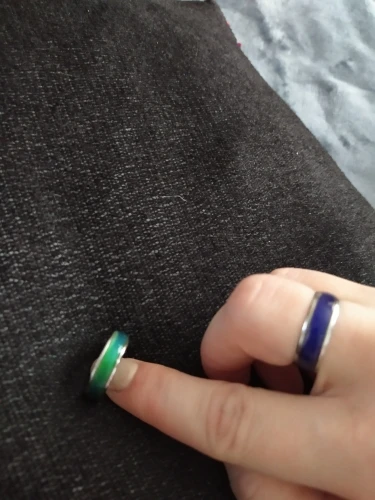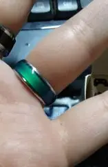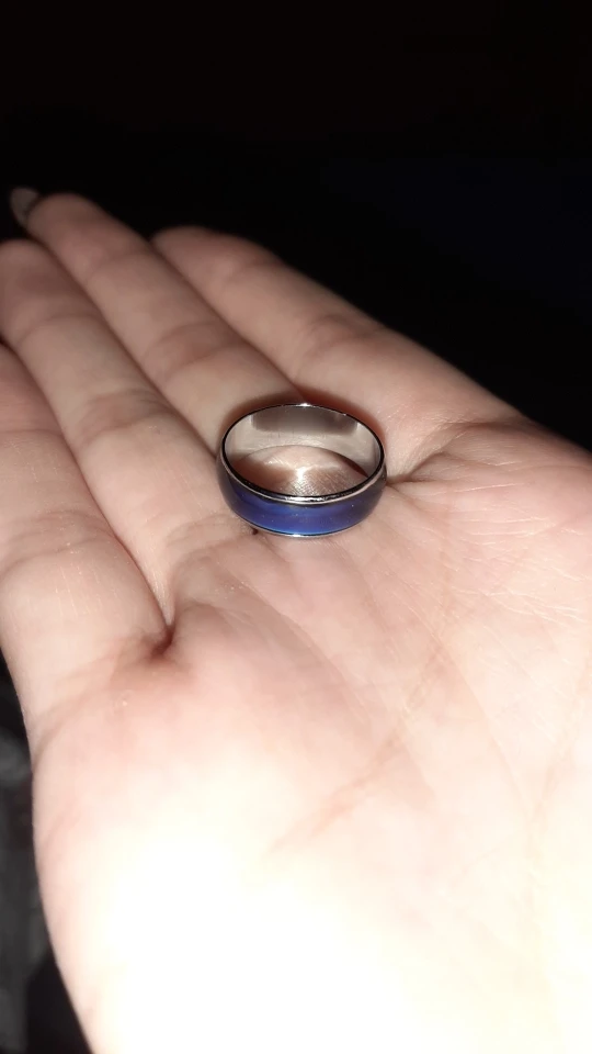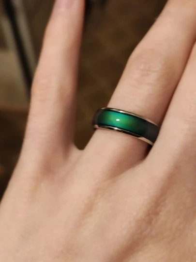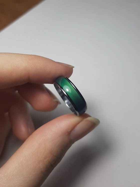 Кольцо меняет цвет от температуры тела, а не от настроения как написано в описании (я это знала, это на заметку тем ктобудет заказывать товар:>). Чёрный цвет - если холодно, Тёмно-синий - если жарко. При нормальная температуре тела кольцо будет зелёного цвета.
