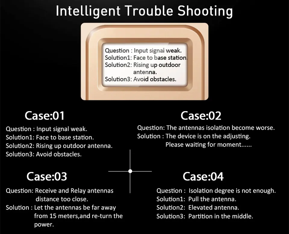 1, умный, чтобы направлять установку с ЖК-дисплеем.2. В режиме реального времени отображается сила сигнала.3. Автоматический режим ожидания, когда пользователь не делает вызов.4. Автоматическая сигнализация при ошибке установки и предоставление соответствующего решения.5. Автоматическая регулировка коэффициента усиления системы, чтобы избежать самовозбуждения повторителя.6. Напоминаем о том, когда устройство было повреждено.