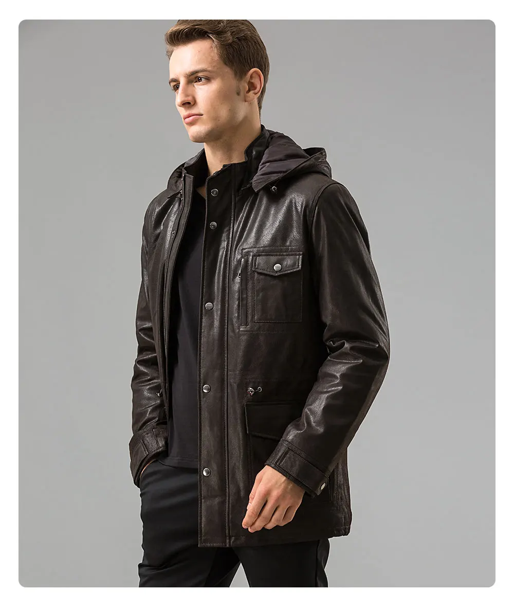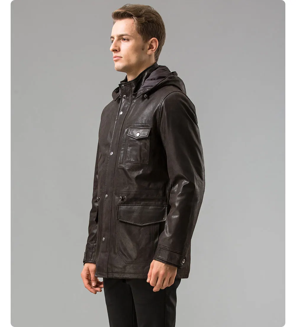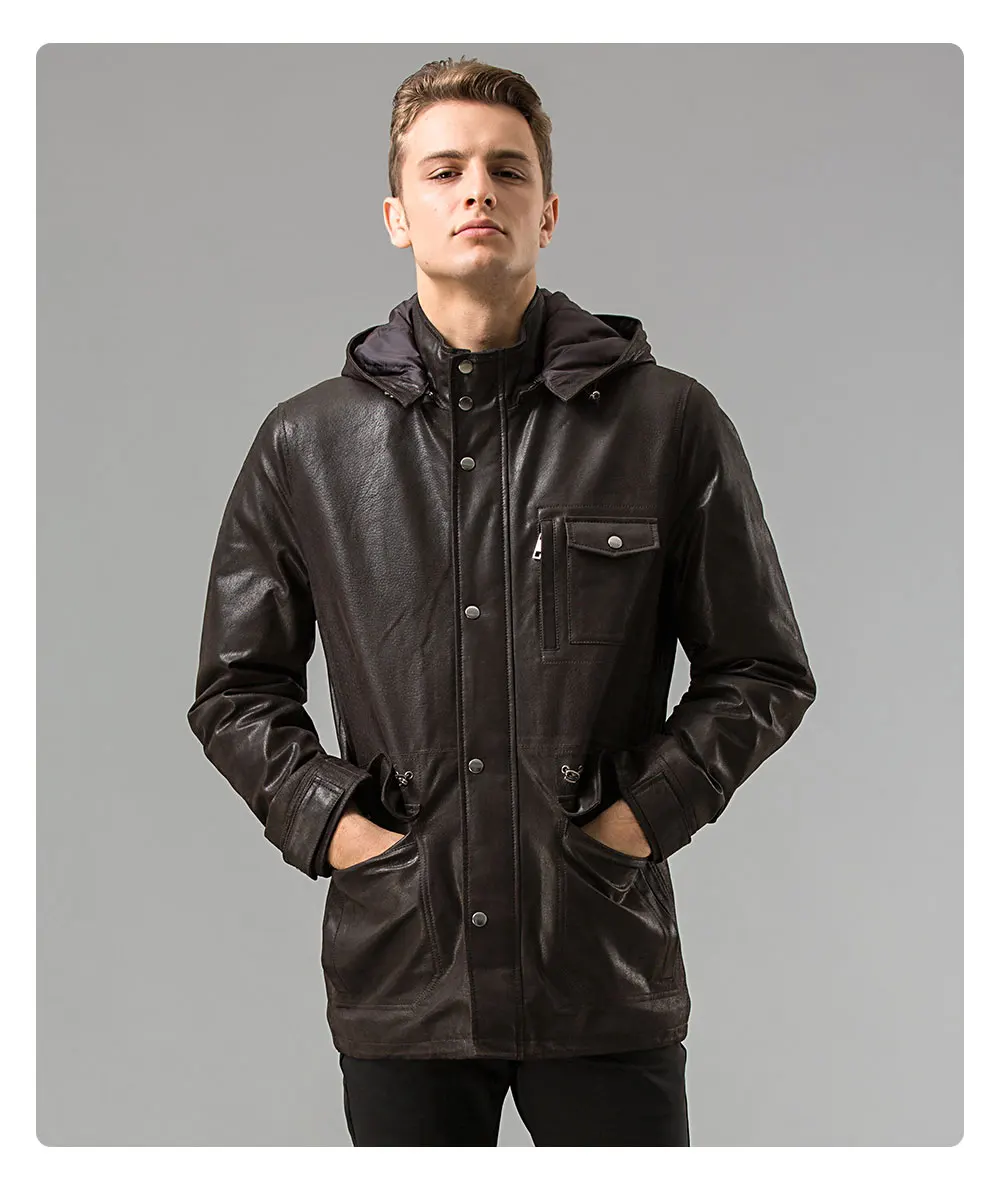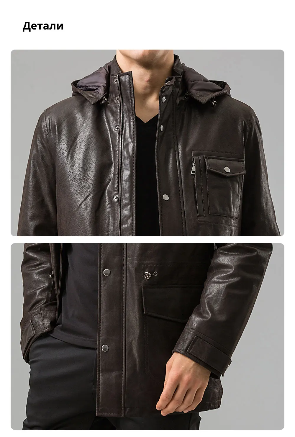 Kожаная куртка мужская теплое пальто с капюшоном, из свиной шкуры, жакет из натуральной кожи, шинель для зимы