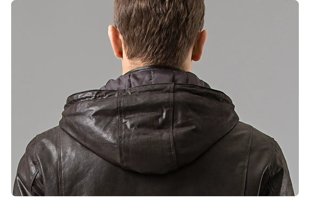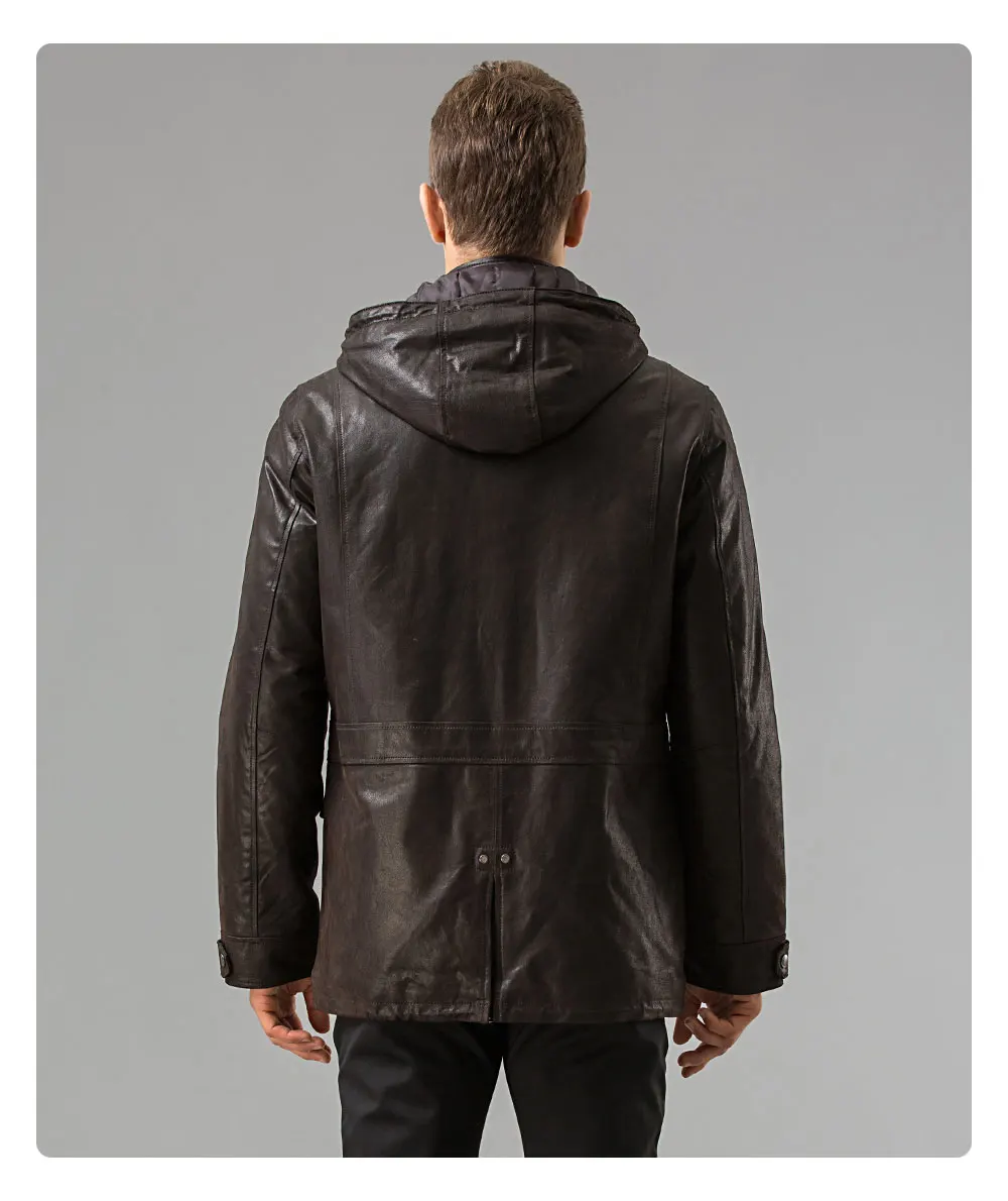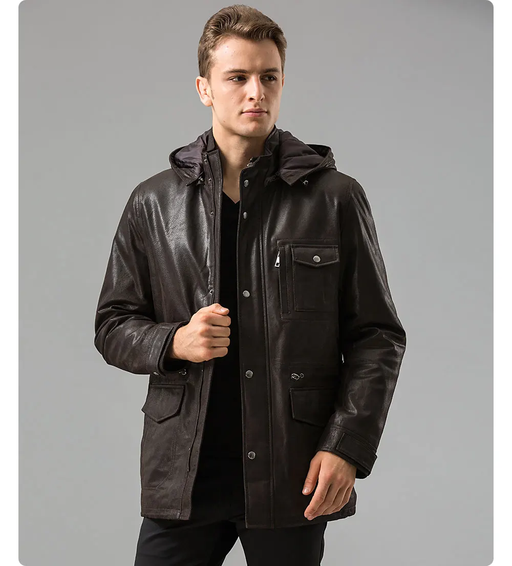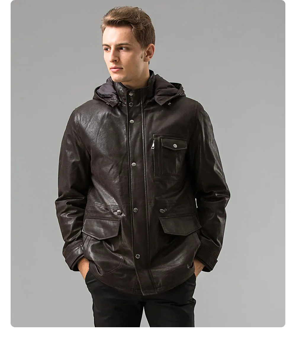 Kожаная куртка мужская теплое пальто с капюшоном, из свиной шкуры, жакет из натуральной кожи, шинель для зимы