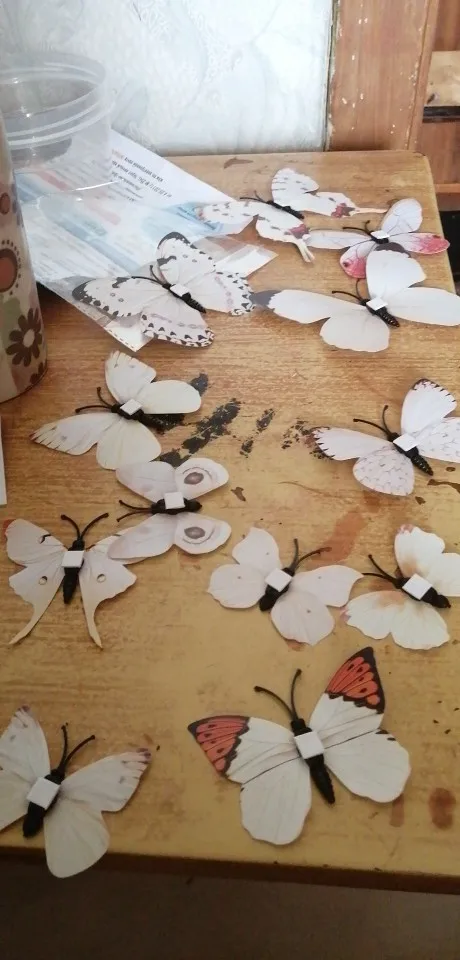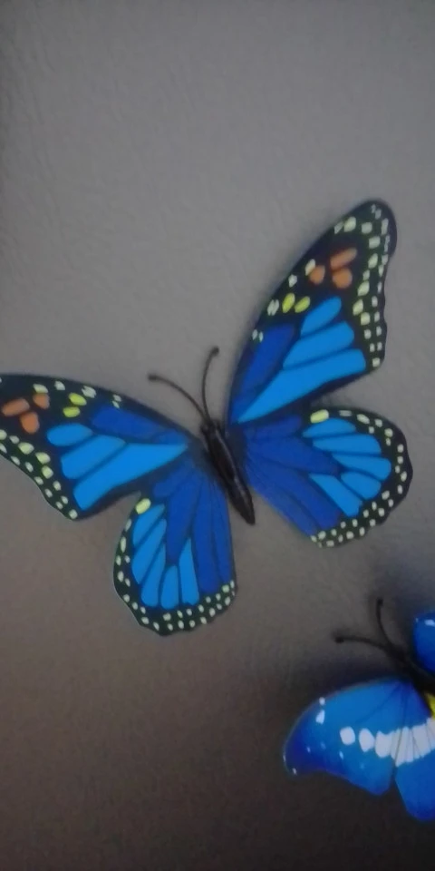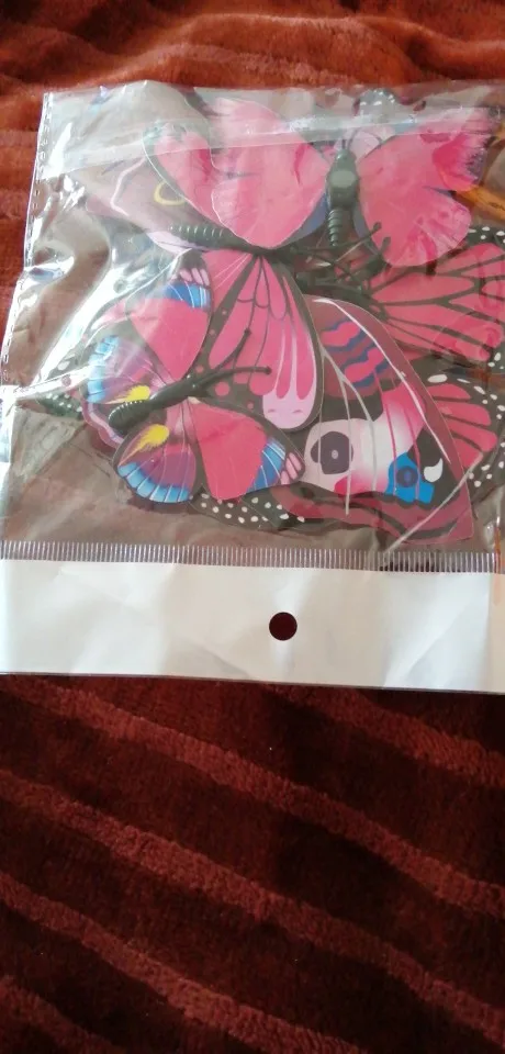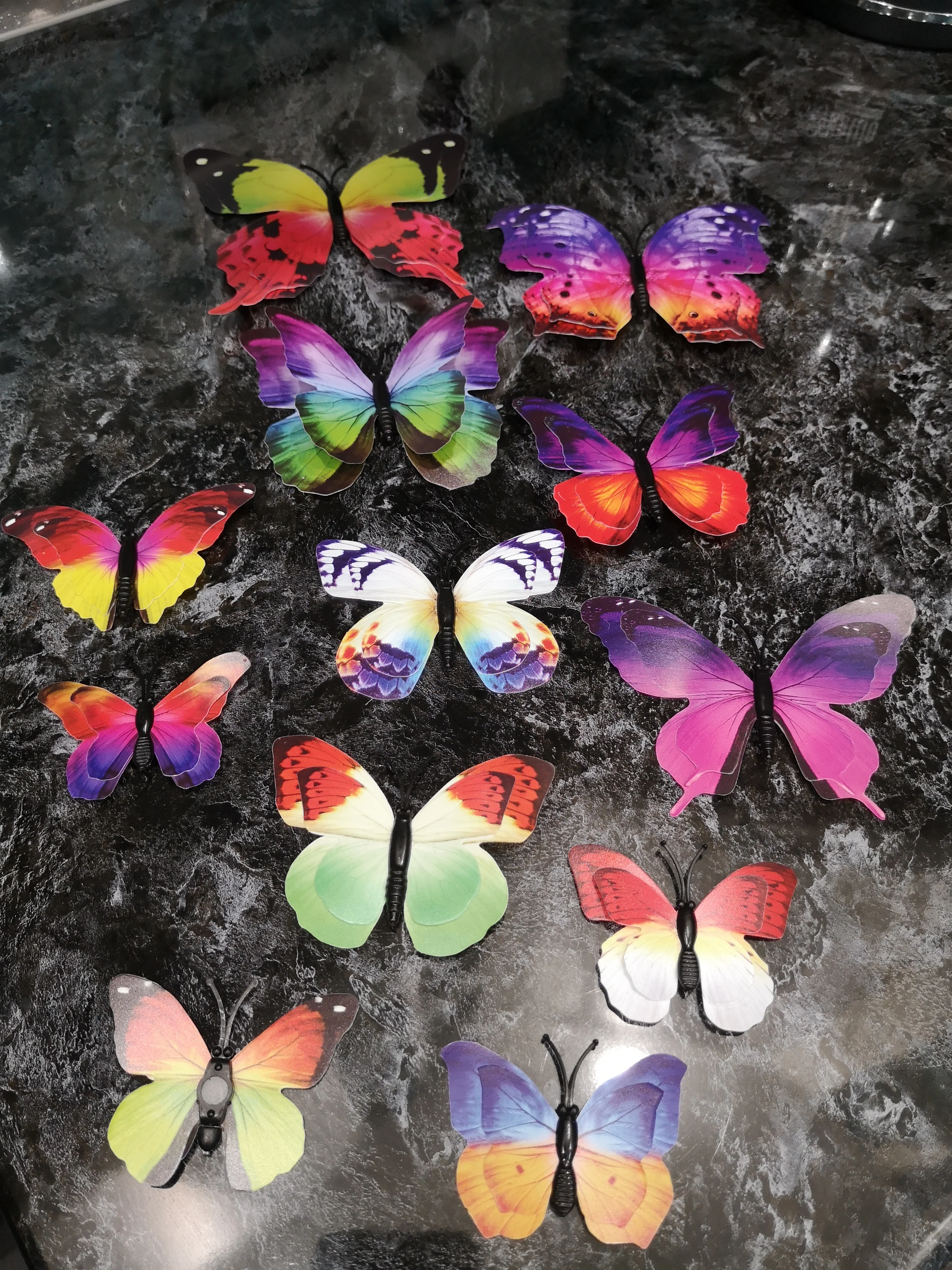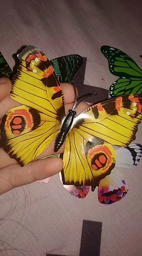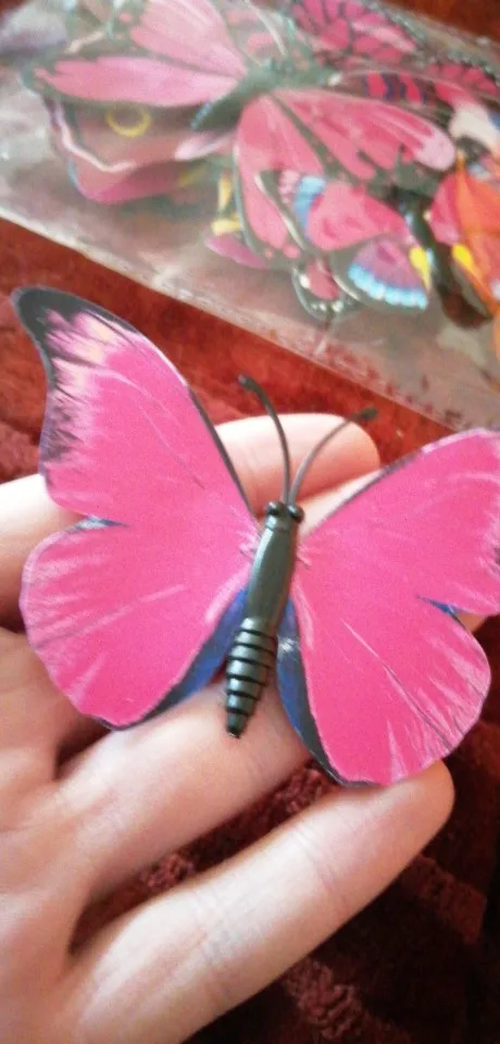 Бабочки оооочень красивые и правдоподобные! Сделанные из качественного материала, на каждой есть маленький магнит, рисунок с двоих сторон, тело сделанное из другого, более твердого материала, есть усики. В наборе есть двухсторонний скотч (на который можно приклеить бабочек). Короче плюсов чрезмерное количество, тем более за такую цену!!! ❤️