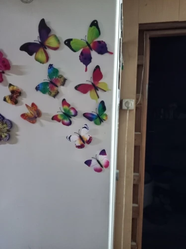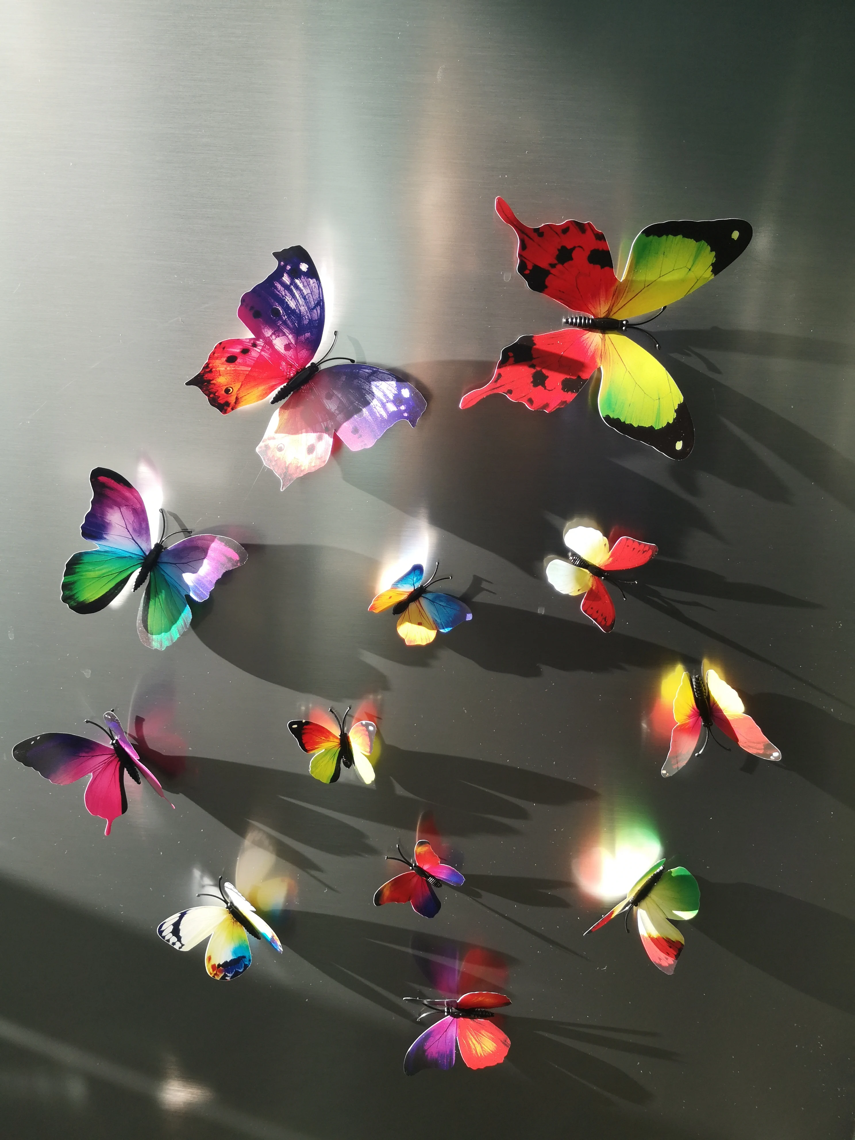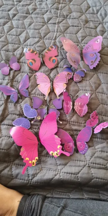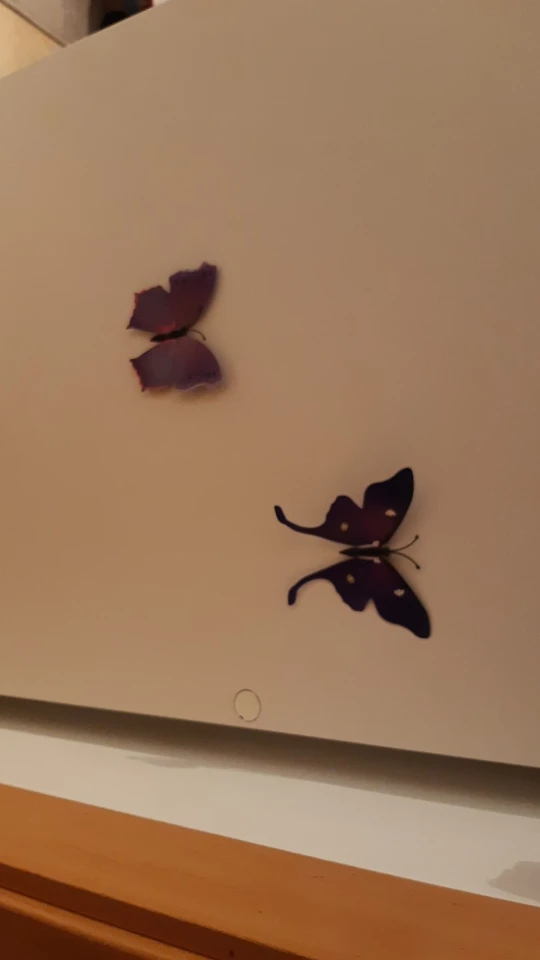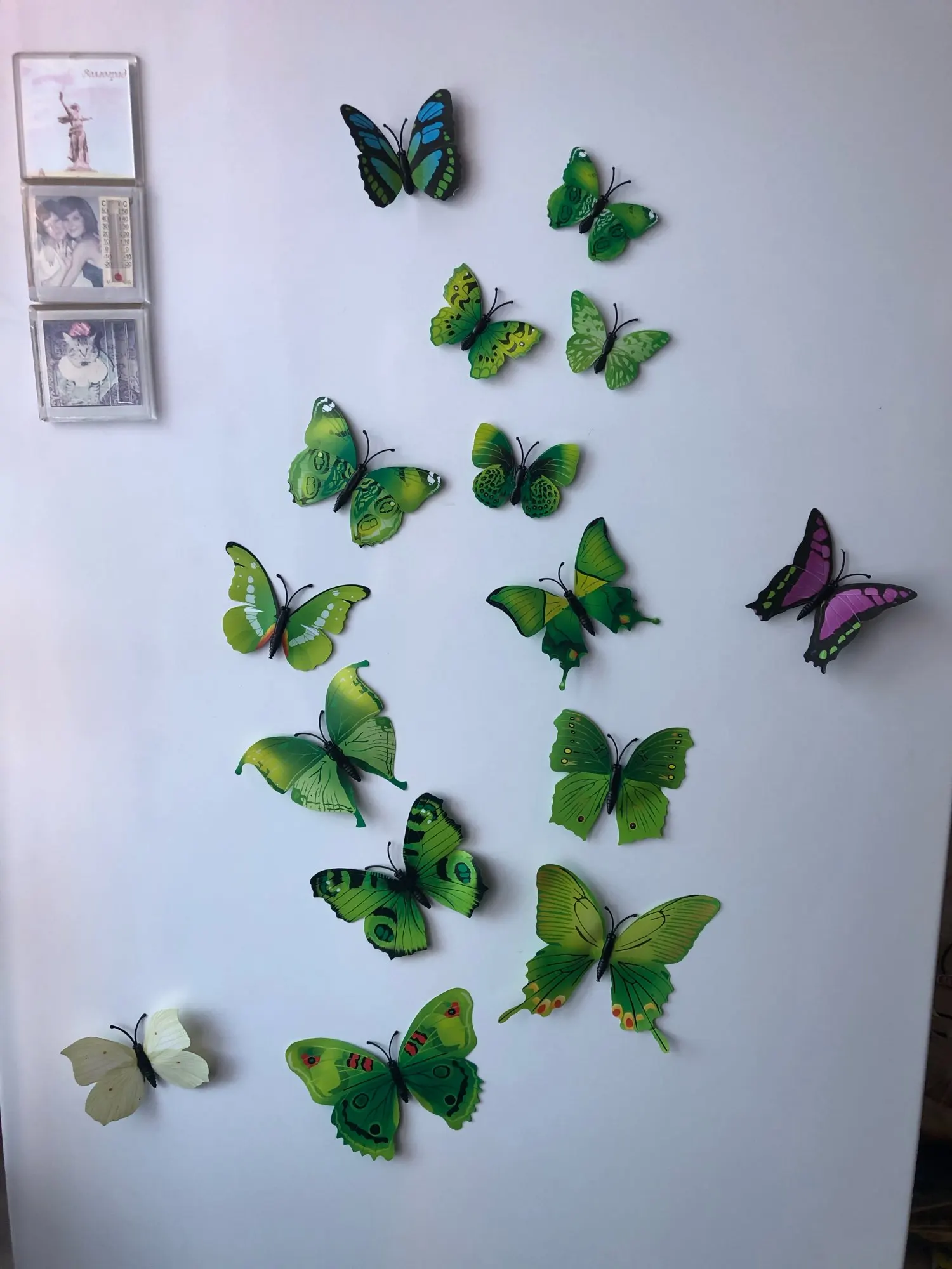 Бабочки оооочень красивые и правдоподобные! Сделанные из качественного материала, на каждой есть маленький магнит, рисунок с двоих сторон, тело сделанное из другого, более твердого материала, есть усики. В наборе есть двухсторонний скотч (на который можно приклеить бабочек). Короче плюсов чрезмерное количество, тем более за такую цену!!! ❤️