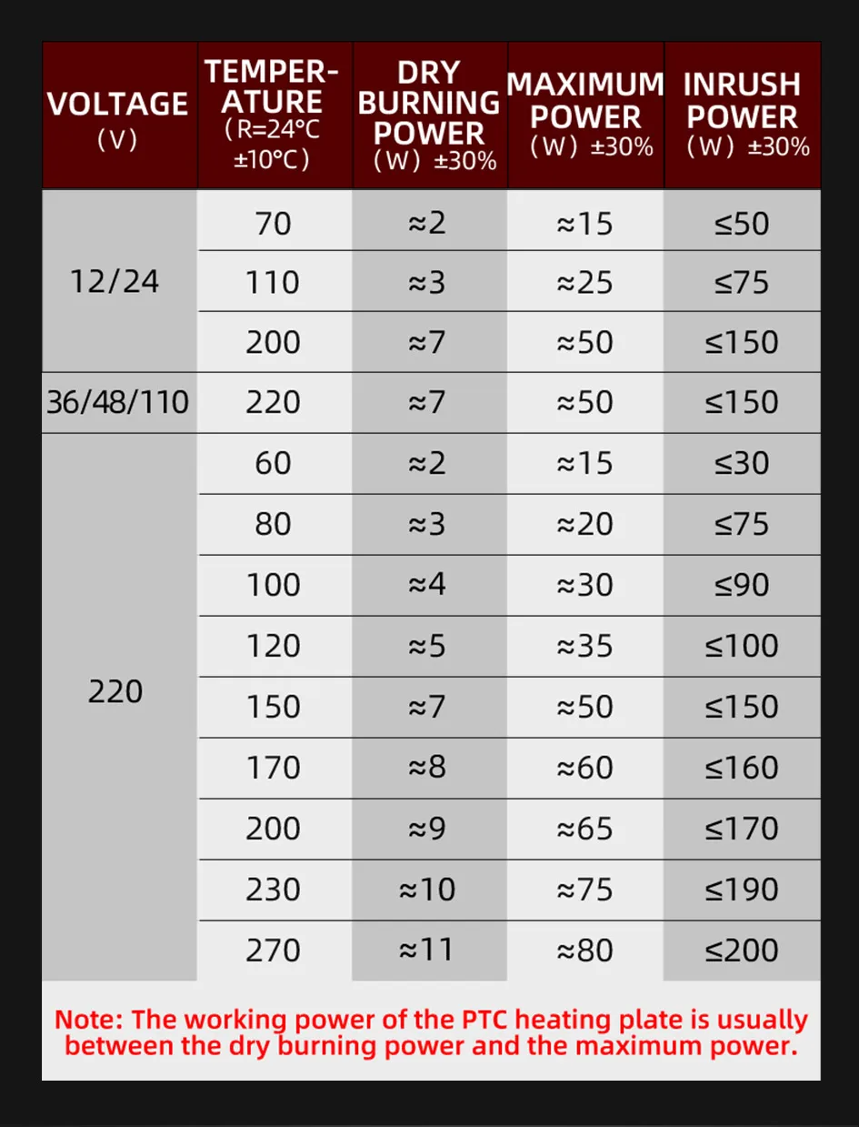 Использование: Этот PTC используется для нагрева воздуха или твердых веществ, не должен быть помещен в жидкости и подвержен воздействию большой пыли.