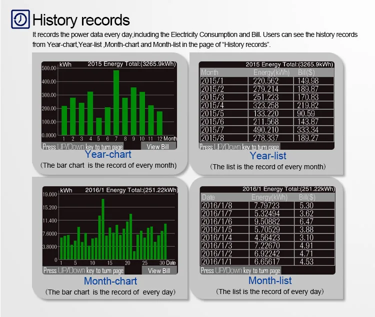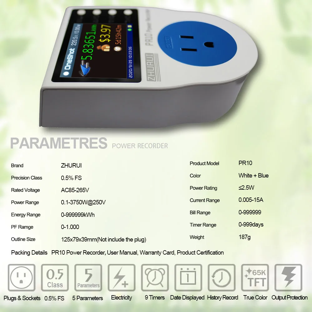 PR10 регистратор электропитания отображается на 2,4 дюймов TFT цветной ЖК-дисплей, и он может измерять различные электрического оборудования, мощность, коэффициент мощности, напряжение, ток, частота, накопленные потребление электроэнергии, накопленные за электричество, накопленное время электричества, потребление электроэнергии в один раз, счет за электричество в один раз и время на электричество в один раз. Ежедневное использование счета за электричество и электричество будет записано, вы можете увидеть форму таблицы или списка истории записей. PR10 подходит для измерения и контроля потребления энергии в домашнем хозяйстве, на фабрике, в офисе и других случаях, и может использоваться для включения или выключения различного электрического оборудования в соответствии с вашими настройками.