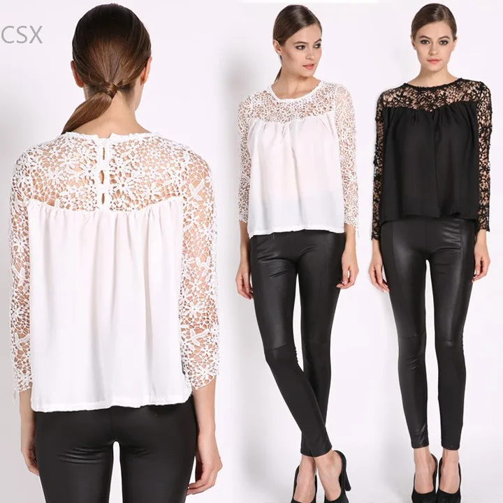 Новая мода женщин Вязание крючком кружева шифон Вышитые Блузки Рубашки Топы
