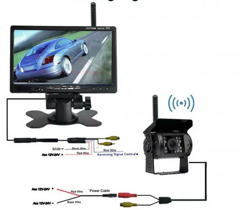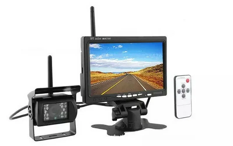 -2,4 ГГц беспроводной передачи видео в режиме реального времени, зеркало заднего вида, в то время как резервного копирования.-7 дюймов TFT-LCD цветной экран, с высоким разрешением 800x480, CMOS Число эффективных пикселей датчика изображения.-IP66 водонепроницаемая, высокопрочная металлическая камера, долговечная для использования в автомобиле и вне его.-С 18 IR светодиодный светильник ночного видения, собирает заполняющий светильник ночью.-Угол обзора 170 градусов, для широкого и четкого обзора.-Компактный дизайн и простота установки, удобно носить с собой и использовать.-Дизайн от солнца, против ослепления.-Поддержка дистанционный пульт, диапазон: 5 м, с 3,7 V литиевая батарея.Камера:-Датчик изображения: CMOS-Система сигнала: PAL / NTSC-Изображения пикселей: PAL / NTSC-Минимальное освещение: 1.0Lux / F1.2 (ИК светодиодный)-Диагональный угол обзора: 170 градусов-Источник питания: 24 В постоянного токаМонитор:-7 дюймов TFT ЖК-дисплей экран-Частота передачи: ISM 2400 МГц-2485 МГц-Расстояние передачи без блока: 100 м-Эффективные пиксели: 480x234-Чувствительность приема: -85 дБм-Видеосистема: NTSC / PAL-Источник питания: DC 24V / 1.5A