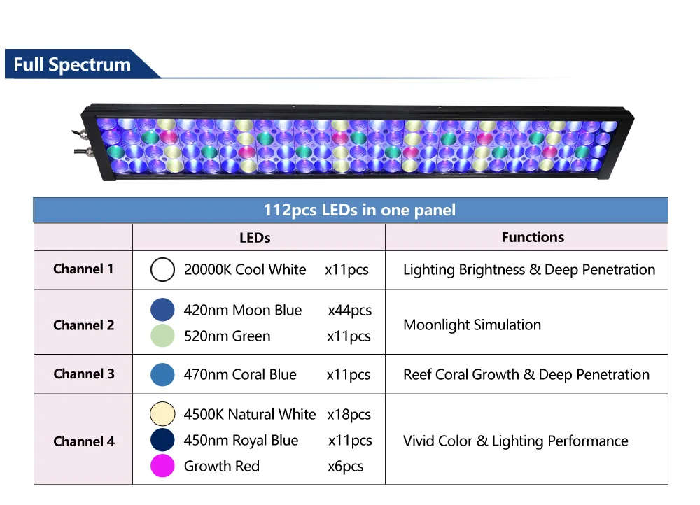 Это очень хороший свет. Конструкция отличная, высокая PAR, хорошее распространение и очень настраиваемый световой график через металлическую коробку контроллера. Я использую с двумя дополнительными боковыми лампами, но это не нужно, основной свет достаточно. Моя одна рекомендация заключается в том, чтобы изменить расположение светодиодов. В настоящее время вдоль передней части есть полоса белого цвета и полоса синего цвета вдоль задней части (450 мм). Если лампы не установлены очень высоко, это приводит к синему фону и белой передней поверхности-это может быть легко зафиксировано путем смешивания этих двух каналов вверх. В идеальном случае, я бы также хотел, чтобы все синие были отделены от белого канала, но это не слишком сложно. Более того, я действительно впечатлен этими огнями до сих пор!