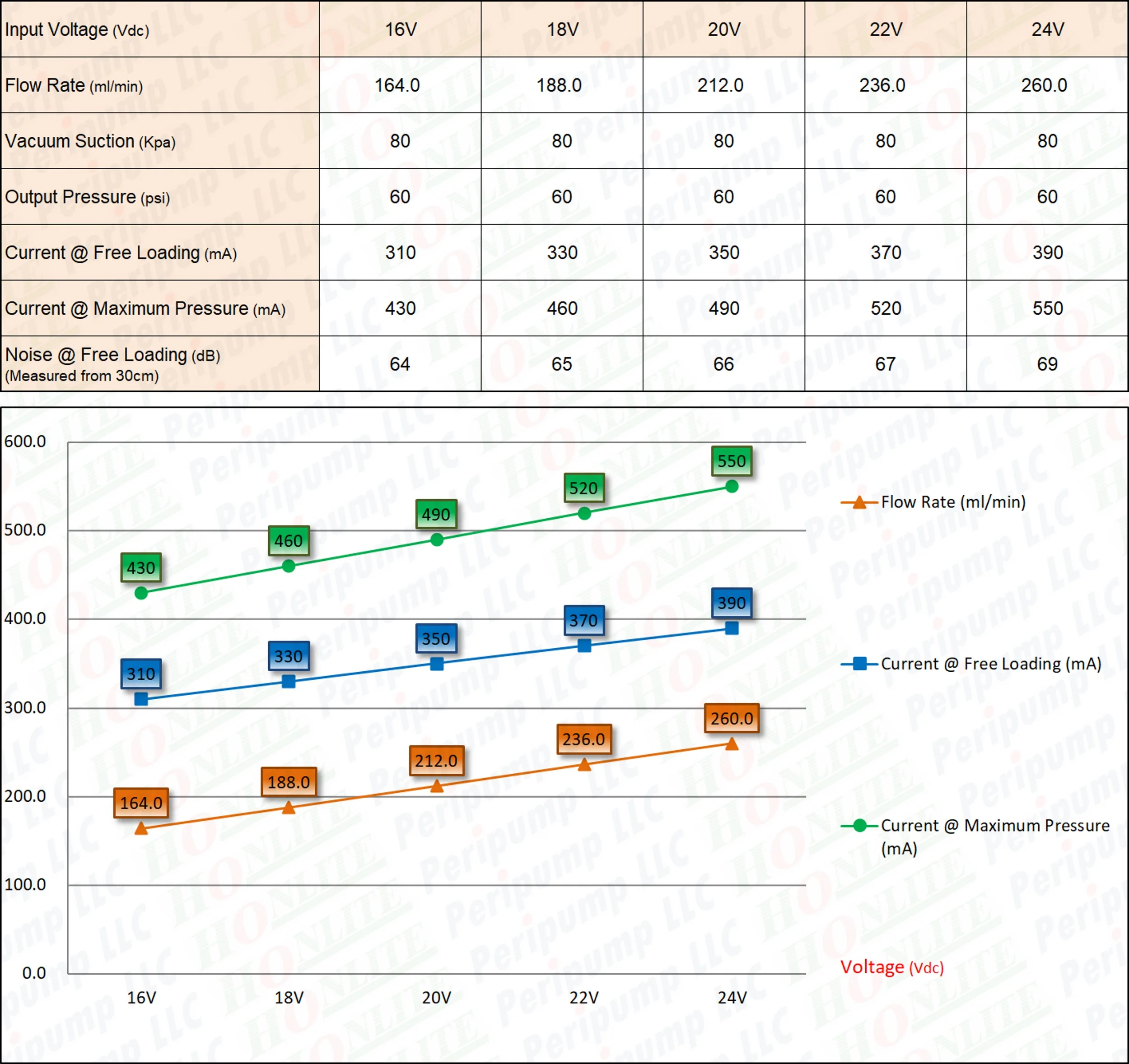 Скорость потока определялась водой. В случае, если вы намереваетесь использовать этот насос для управления жидкостью с вязкостью, тогда расход будет импульсирован. Чем выше вязкость жидкости, тем ниже будет расход. В худшем случае насос может вообще не управлять жидкостью.