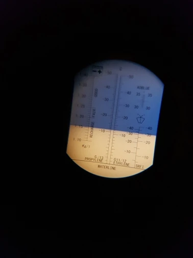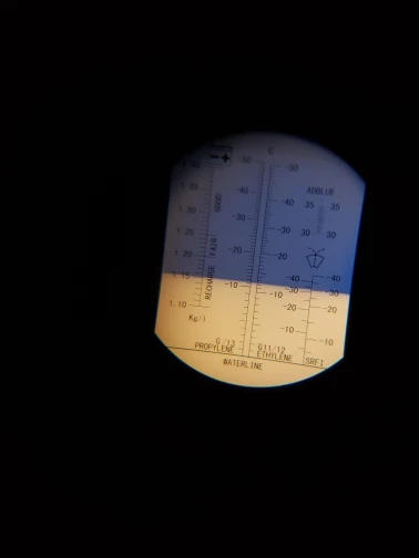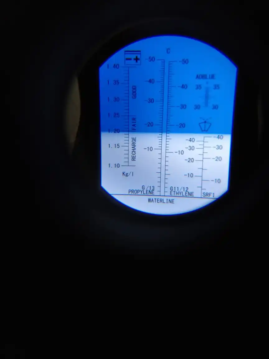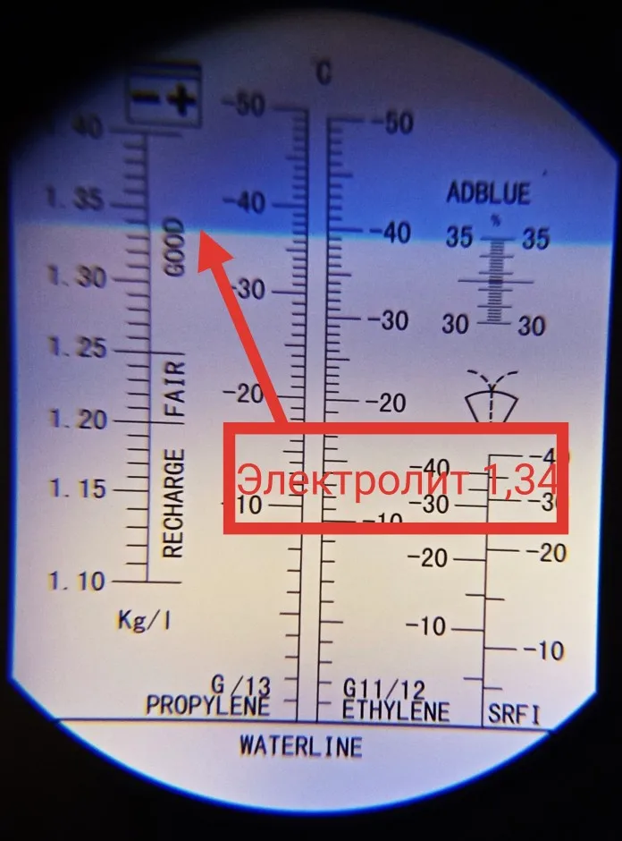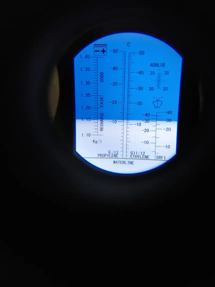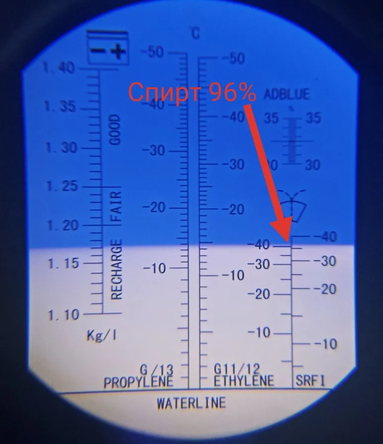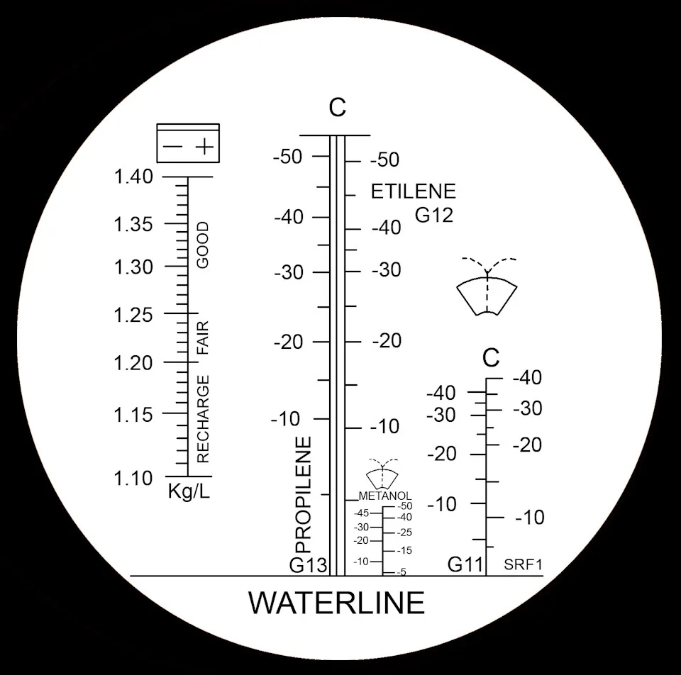 Рефрактометр. *слева шкала для определения состояния электролита батареи *центр шкала G13-для определения точки замерзания антифризов на основе пропилена гликоля * центр шкала G11/G12-для определения точки замерзания антифризов на основе этиленгликоля. * левая шкала на основе этанола. * правая шкала Изопропиловый спирт SRF1-шкала . *верху справа шкала мочевины для измерения AdBlue. Метанол не измеряет! Для метанола купить рефрактометр RZ127. На фото для метанола можно примерно узнать и температуру замерзания. -30°С стеклоомывающей жидкости на основе метилового спирта, соответствуют примерно -8°С по шкале SRF1.