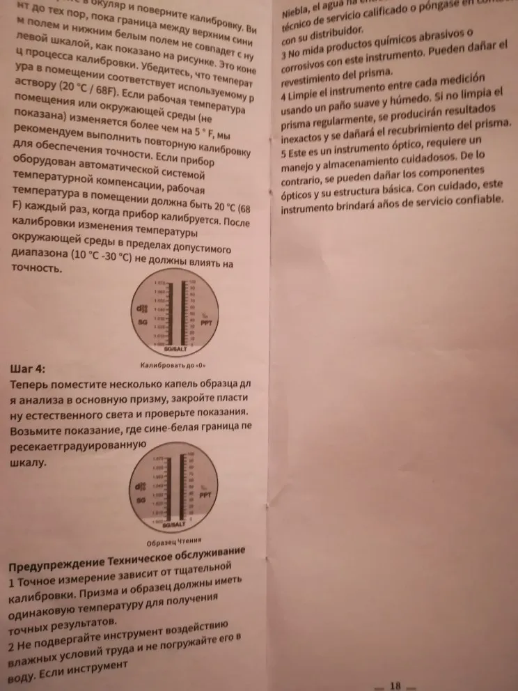 Прибор выглядит отлично. Видимо уже откалиброван, на воде из крана показал 0. На антифризе из магазина -42 при обещанных -40, что вполне логично, лучше сделать немного крепче чем немного жиже и получить конфликт. Инструкция удивила внезапным переходом на Espanol language (?). Машинный перевод английской инструкции выглядит местами лучше предложенного перевода. Будем проверять.