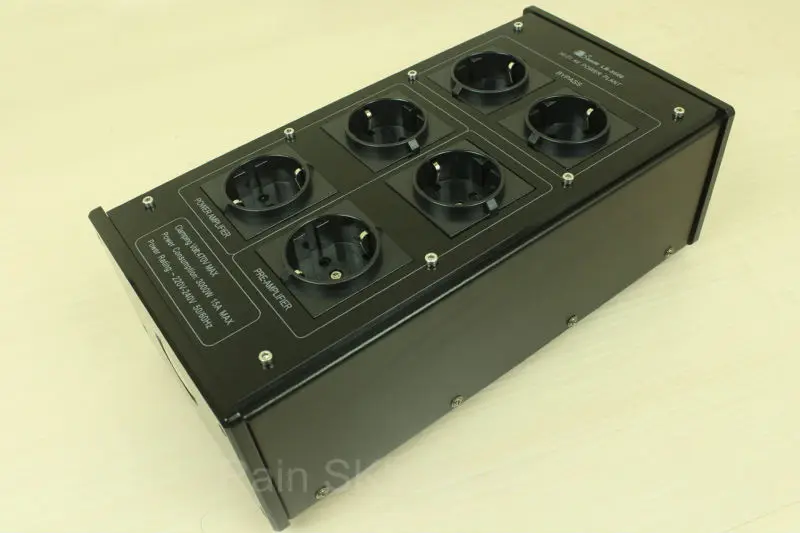 100% новый в коробке ·Полное гнездо Schuko· 3300 Вт/15А электростанция с защитой от перенапряжения· 2 отдельных гнезда для ПК, Preamps & Sources (CD/DVD плеер, DAC)· 2 отдельных гнезда для усилителя, приемников, Vedio источников· 2 отдельных гнезда без линейных фильтров
