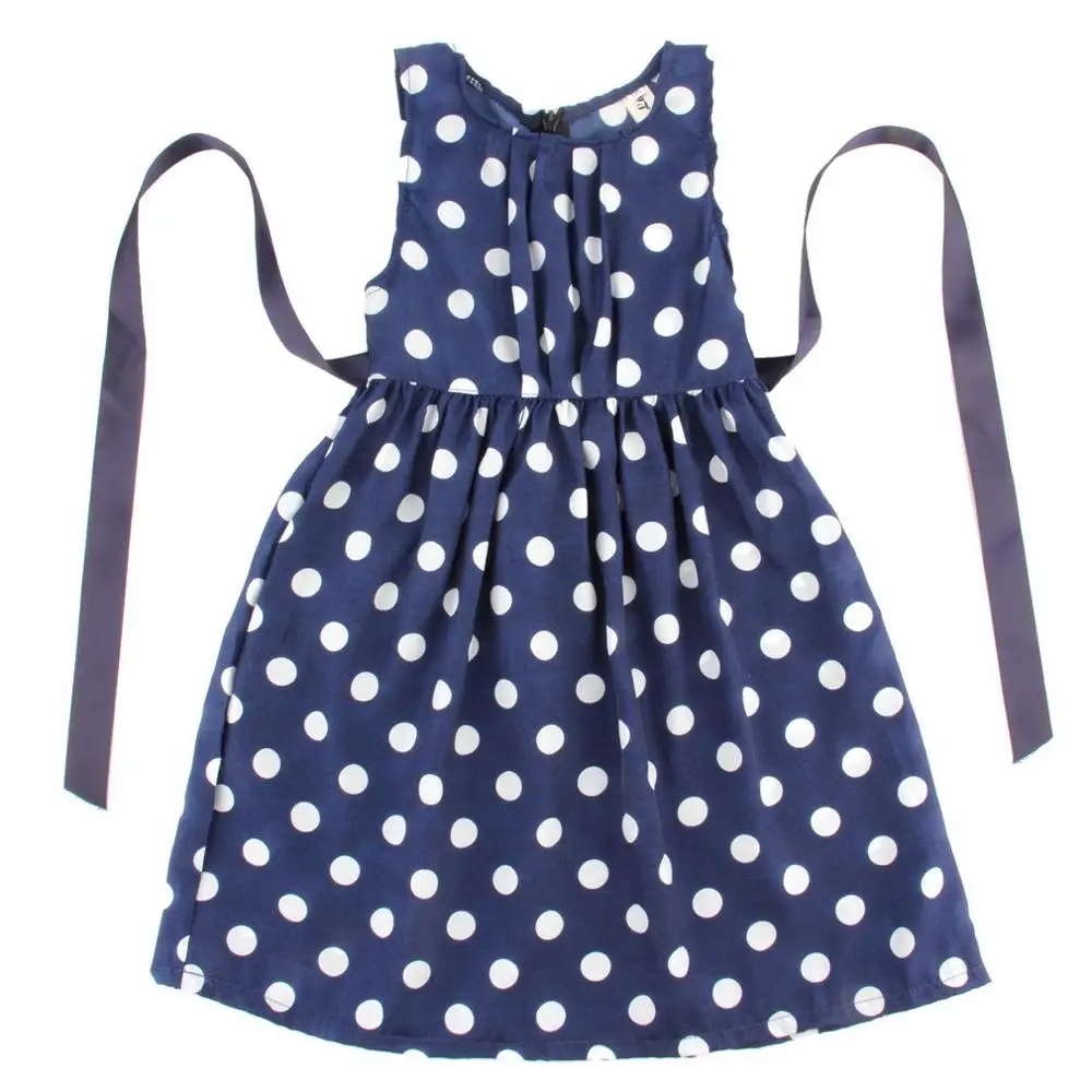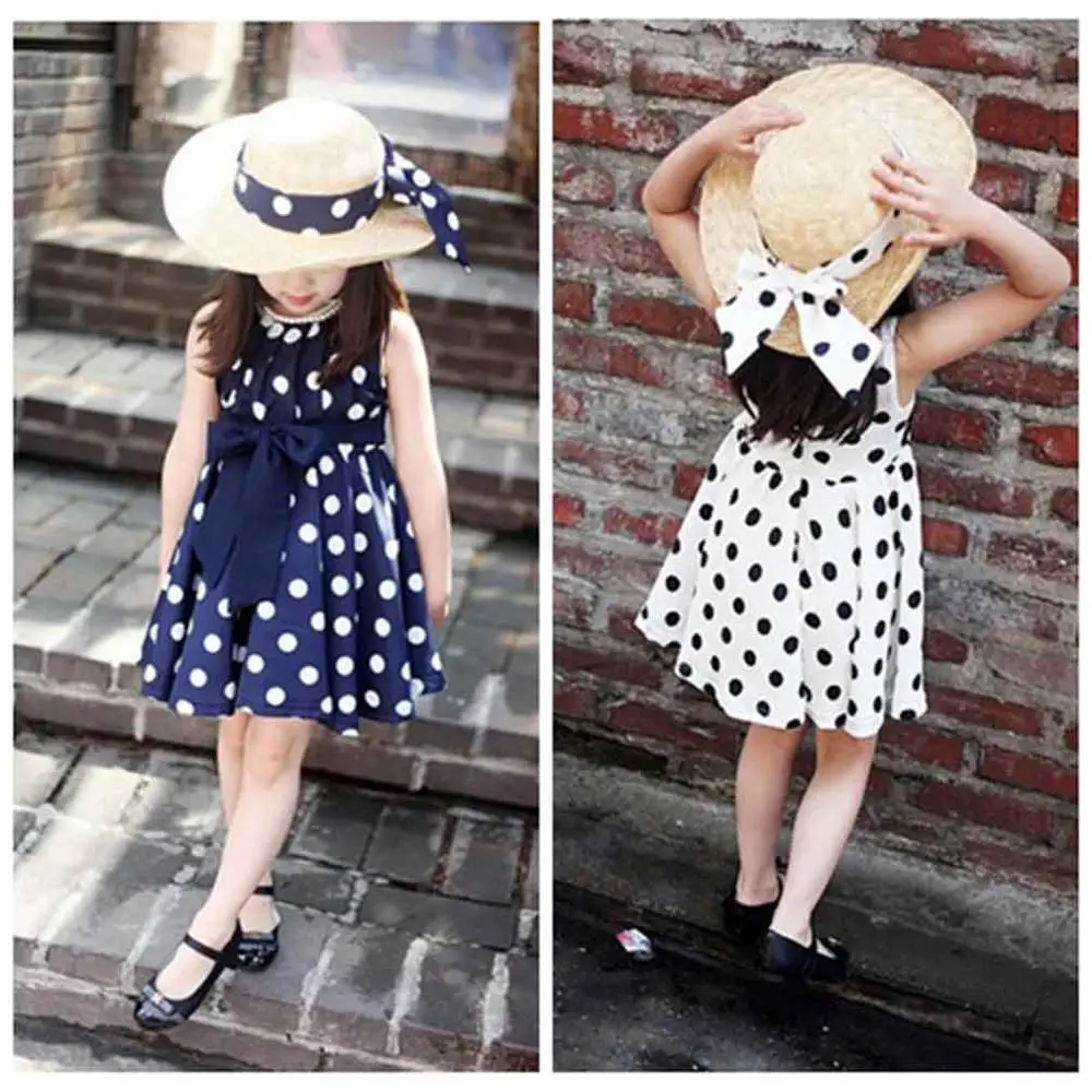 Новинка 2016, стильное детское платье принцессы для маленьких девочек, платье без рукавов в горошек с бантом! Высококачественный темно-синий