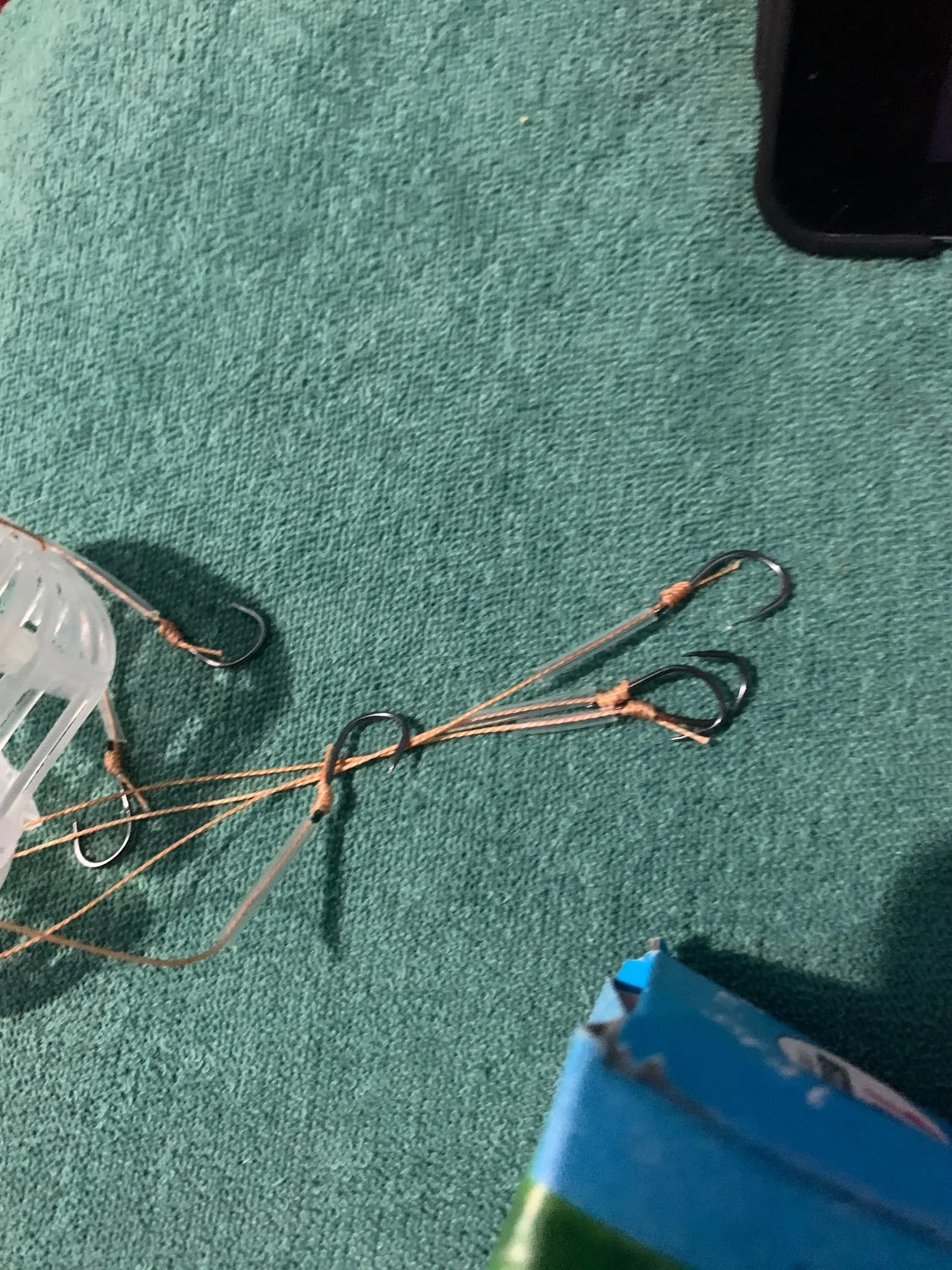 массивные крючки ,крепкий шнур. кормушка не очень прочная .