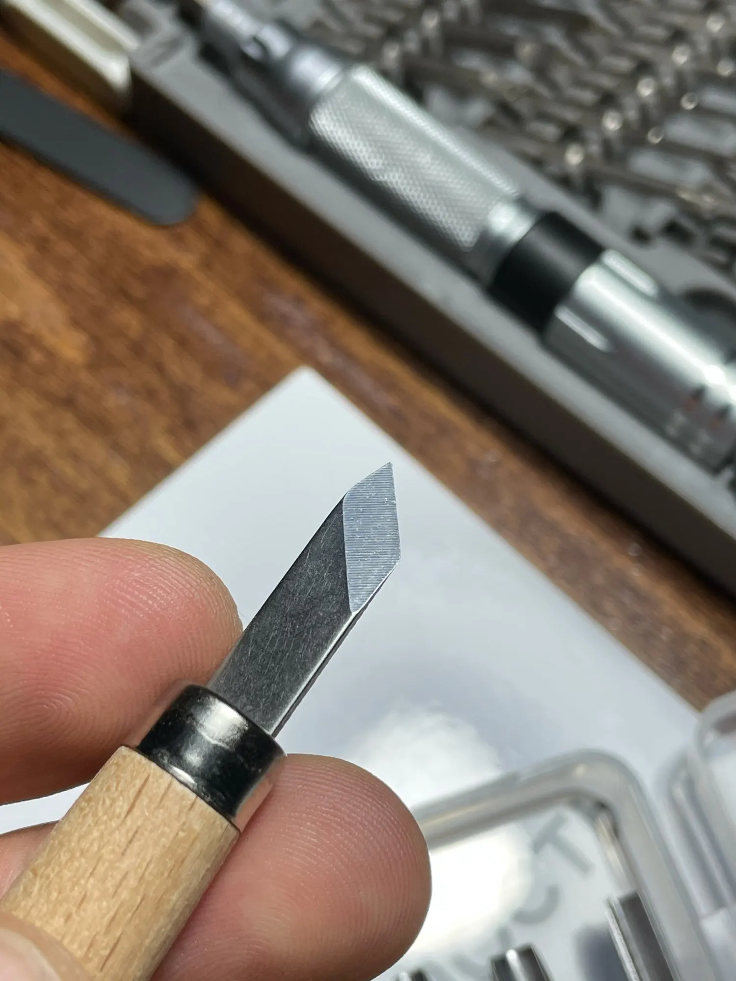 Ну, что сказать? Товар доставлен за 20 дней. Красивая коробочка. Логотип. Красивые ручки из хорошей древесины. Но не очень удобные. Резцы в ручке держатся плотно. Покрыты хромом. Продавец сработал отлично. Все по-честному: видео, описание, фото. Ах, да! Продавец утверждал, что материал резцов сплав SK2 – аналог нашей инструментальной стали У12. Из неё надфили делают. Проверил. Действительно, надфиль не царапает. Но неважно заточены. Надо самому поработать. Цена вполне соответствует качеству. Поэтому продукт этот рассматриваю как игрушечное учебное пособие для ребёнка. Как и написано в описании – для хобби. Впрочем, для этого я его и покупал. Так что всем спасибо.