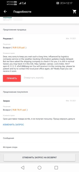 Посылка не пришла и вернулась продавцу обратно. В свою очередь продавец обещал вернуть деньги, рекомендовал открыть спор, но в процессе урегулирования оценил сумму возврата в 0руб. Спор длился около месяца, сумма не большая 70р, пусть оставит их себе, надоело ждать. Вольтметр застрял на таможне, покупать их оказывается нельзя, это нарушение таможенного законодательства. Имейте это ввиду.