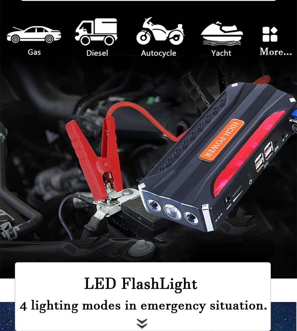 Быстрый запуск 12V бензиновый автомобиль (до 3.5L) и дизельный автомобиль (до 2.5L) за считанные секунды в тех случаях, когда автомобильного аккумулятора. Когда вы путешествуете в небольшом месте, и ваш автомобильный аккумулятор не работает, вы можете использовать этот автомобильный стартер для запуска вашего автомобиля.
