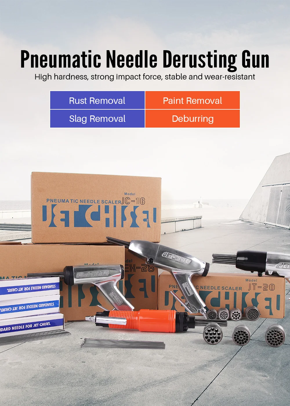 Может использоваться в различных областях.Такие как: используется с различными типами пистолетов для удаления ржавчины, подходит для удаления ржавчины корабля, падение шлака после сварки, кованый песок и гравий, падение бетона шероховатой поверхности, покрытие железной пластины и удаление ржавчины, И т. Д. Игольчатый луч используется для удаления неровности работы на высокой скорости 4000-4500 оборотов в минуту, что особенно подходит для операций на кораблях.