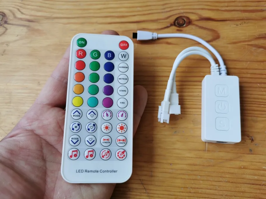 Приятный пульт, батарейки 1260 нет в комплекте. Хороший контроллер, но режим радуги какой то странный... В программе 160 режимов. Пульт радио, ИК ему не требуется и бьет далеко. Странная разводка проводов - датчик ИК выведен в одну сторону с двумя выводами на ленту (запараллеленны), а(запаралеленны) питание в другую сторону. Логично было бы питание и на ленту с одной стороны, а ИК датчик с другой. Чувствительный микрофон.