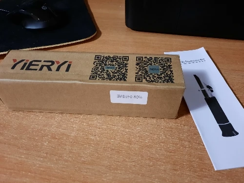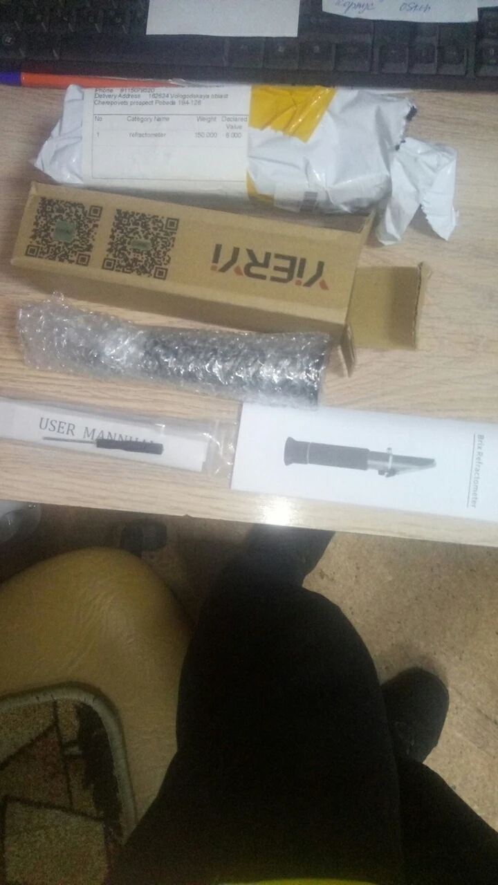 В ходе доставки товара изменился трек-номер (обьединили несколько товаров в одну посылку), но так даже удобней. Доставили за 3 недели, все хорошо упаковано и целое. Рефрактоматр уже был откалиброван, воду показал 0%, а водку 40%. Очень доволен.