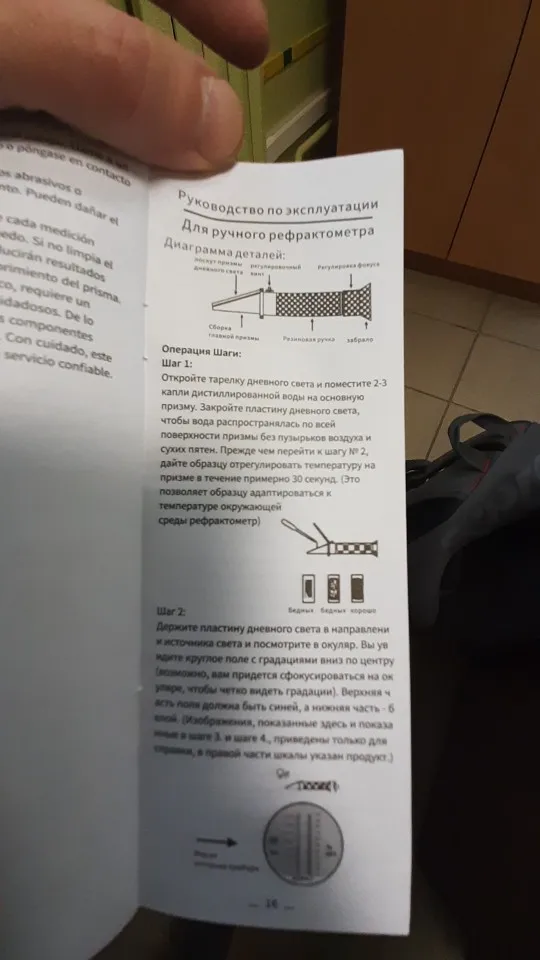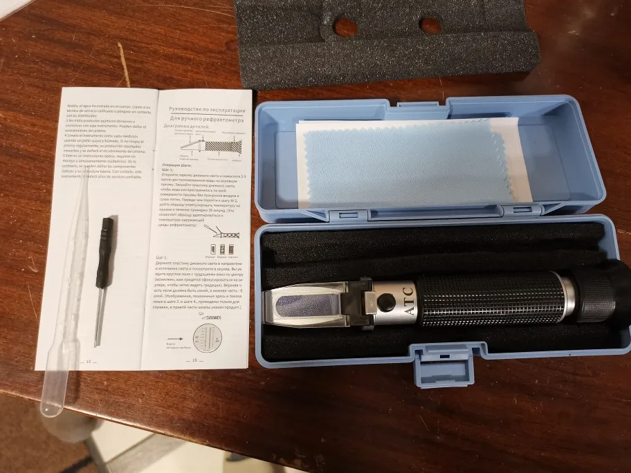 ВБыстрая доставка!Прикольный аппарат.Муж доволен!Сначала откалибровала дистилированной водой(с крышки чайника каплю взяла).Замерили самогон .Всё круто!Всего капля нужна.Рекомендую !В коробке инструкция,отвёртка для калибровки,пипетка ,салфетка и рефрактометр