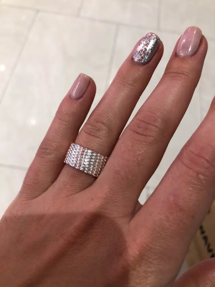 Шикарное. Даже с короткими ногтями и без маникюра , смотрится изящно, украшает руку.