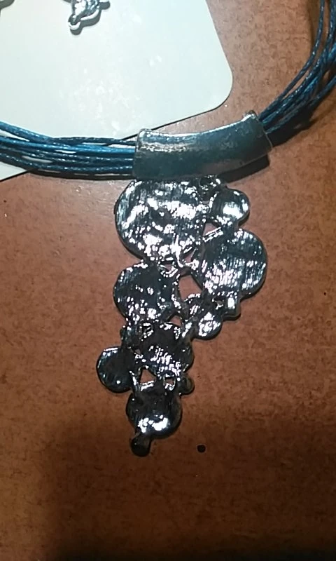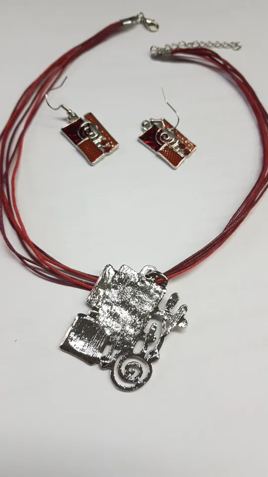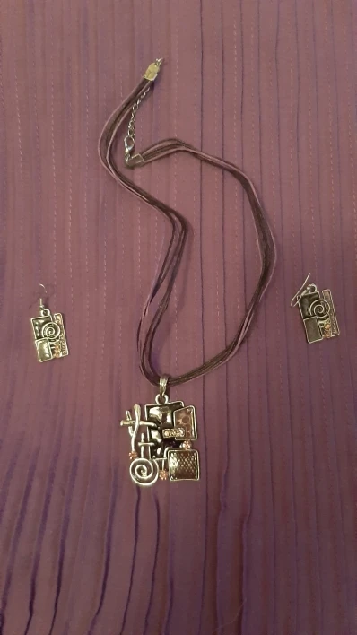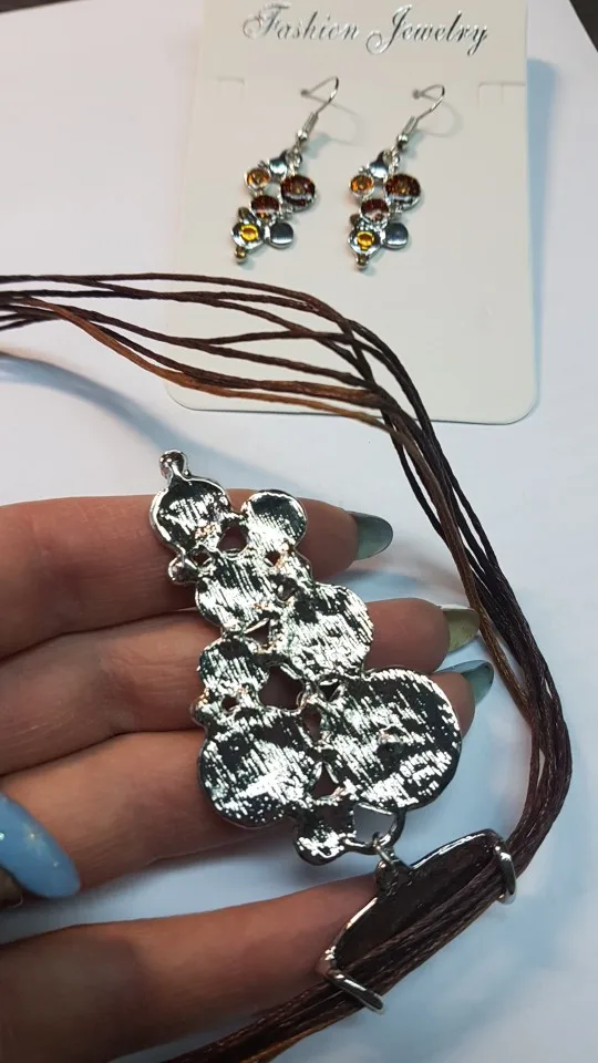 Симпатичный набор. Мне кажется, на фотографиях продавца он выглядит более солидно, массивно. А в жизни он легкий (с другой стороны, это удобнее при ношении), простенький. На ожерелье попался брачок - какой-то наплыв, на последнем фото видно. Резюмируя скажу, что как летний набор будет смотреться неплохо)