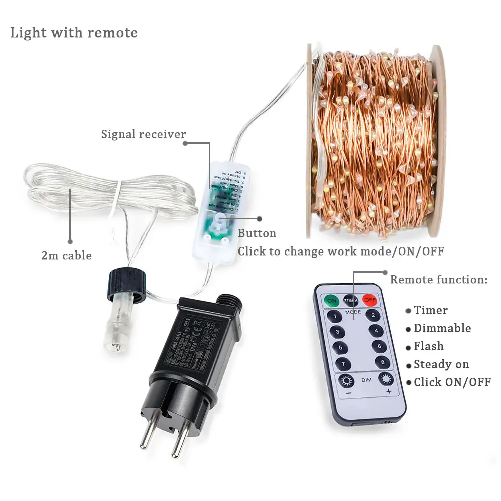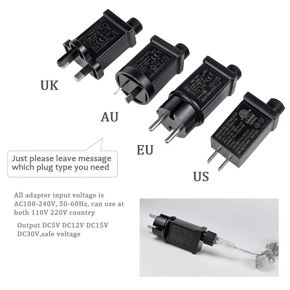 Цвет провода: медный или серебристый цвет освещения: теплый белый, холодный белый, многоцветныйКоличество СВЕТОДИОДНЫЙ: 10 м 100 светодиодный,20 м 200 светодиодов,30 м 300 светодиодов,50 м 500LED,100 м 1000LEDКабель питания: от вилки до первого светодиодный: 2 метраВходное напряжение: AC100-240V, штепсельная вилка США/Великобритании/Австралии/ЕС для опции, пожалуйста, оставьте сообщениеВыходное напряжение: 10 м DC5V, 20 м DC5V, 30 м DC12V, 50 м DC15V, 100 м DC30VВодонепроницаемый: адаптер IP44, струнные огни IP65Сертификация: CE RoHS FCC
