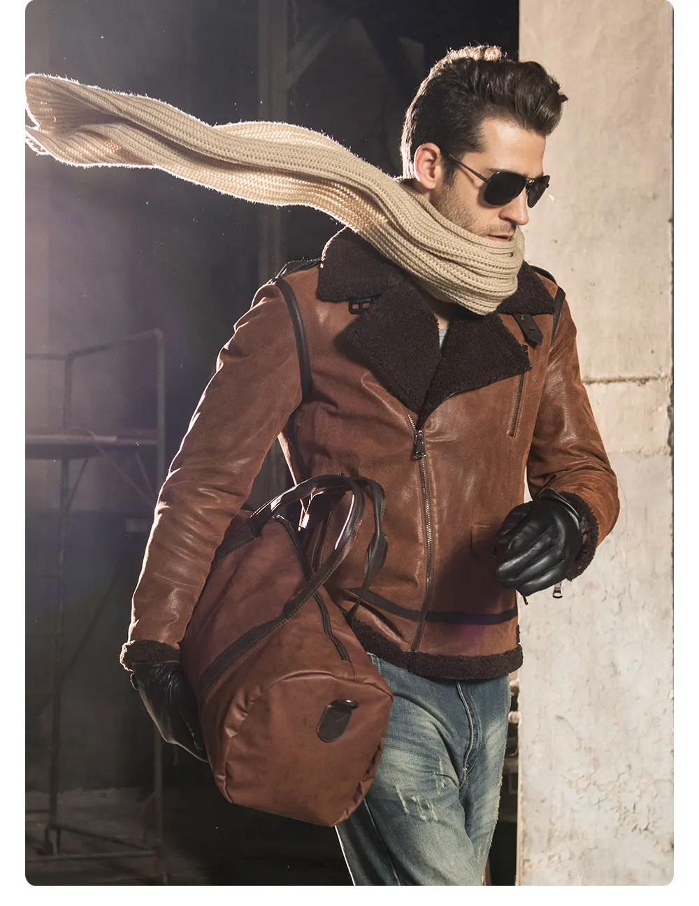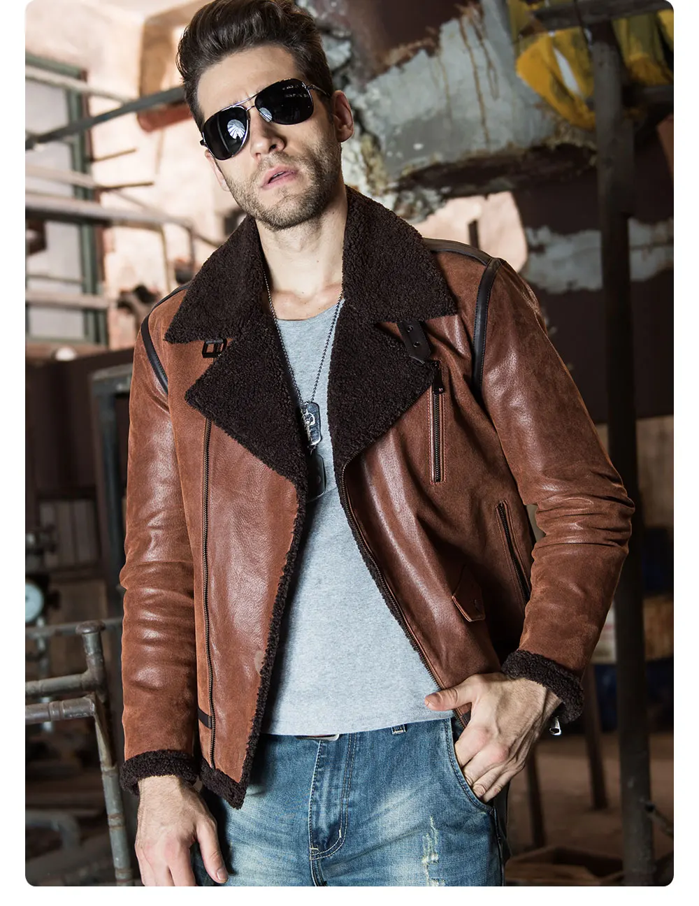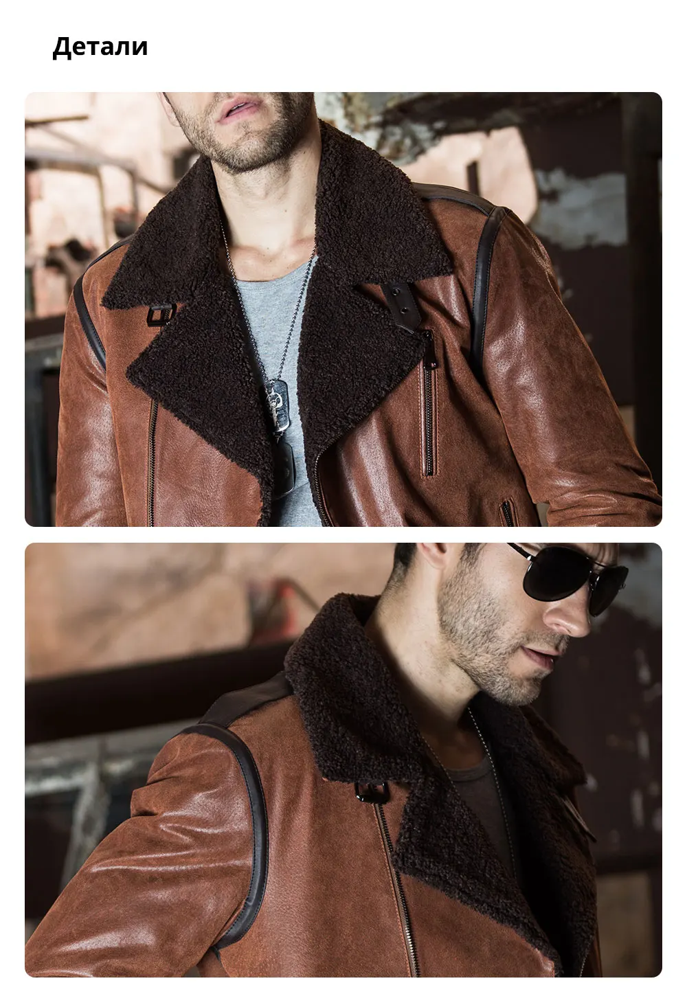 Men's Genuine Leather pigskin motorcycle real leather jackets with faux fur shearling aviator bomber jacket winter coat men