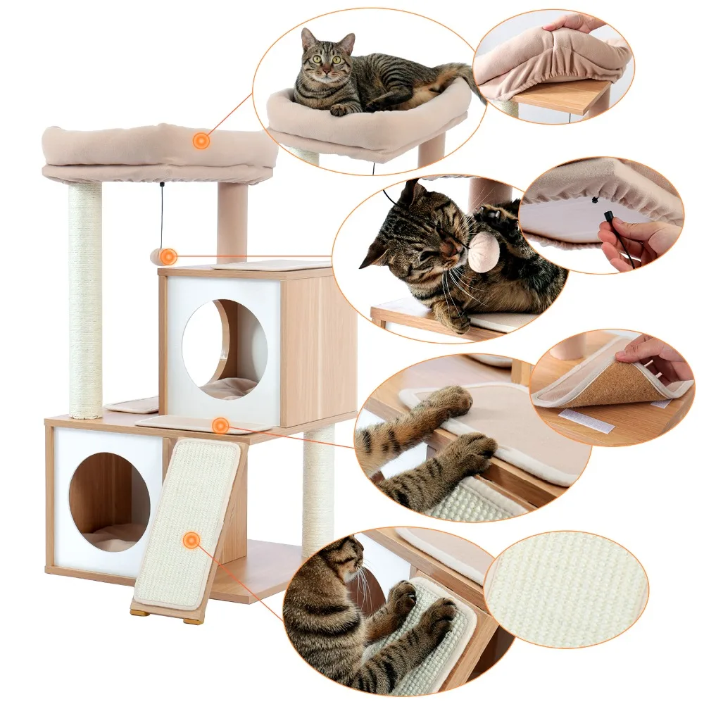 ·Чистый и уютный образ жизни: изготовленный с современным ощущением в натуральном деревянном зерне, чистый, но красивый, отражающий уникальный Шарм современный питомец дома, это кошачье дерево будет тем, что вы хотите показать. Комбинированный со съемным и моющимся ковриком на каждой платформе не только обеспечивает лучшую защиту для вашего котенка, но и для легкой очистки. Ультра-мягкая подушка тщательно помещается в каждую квартиру, предлагая более теплую и уютную среду для игры и сна.