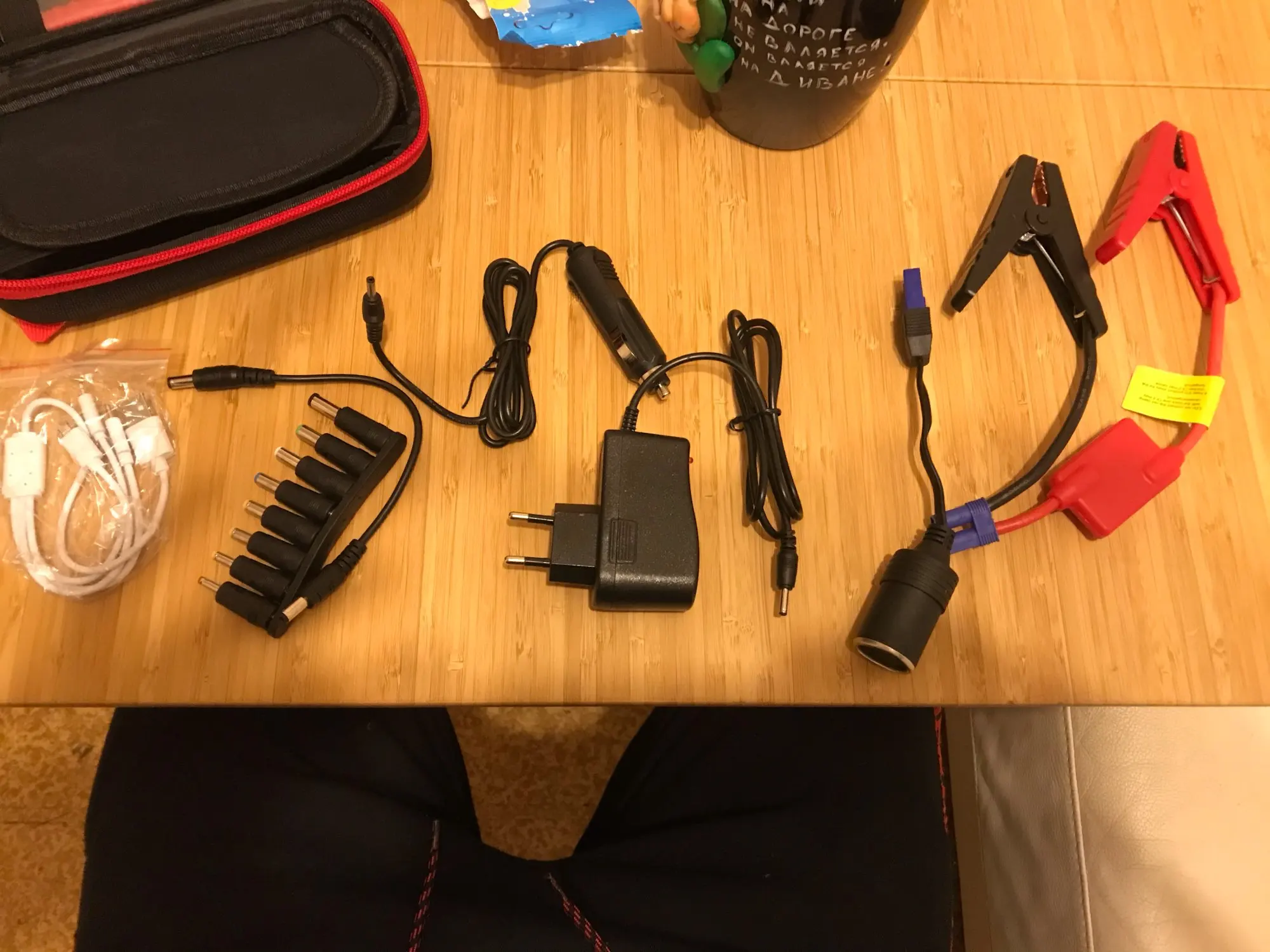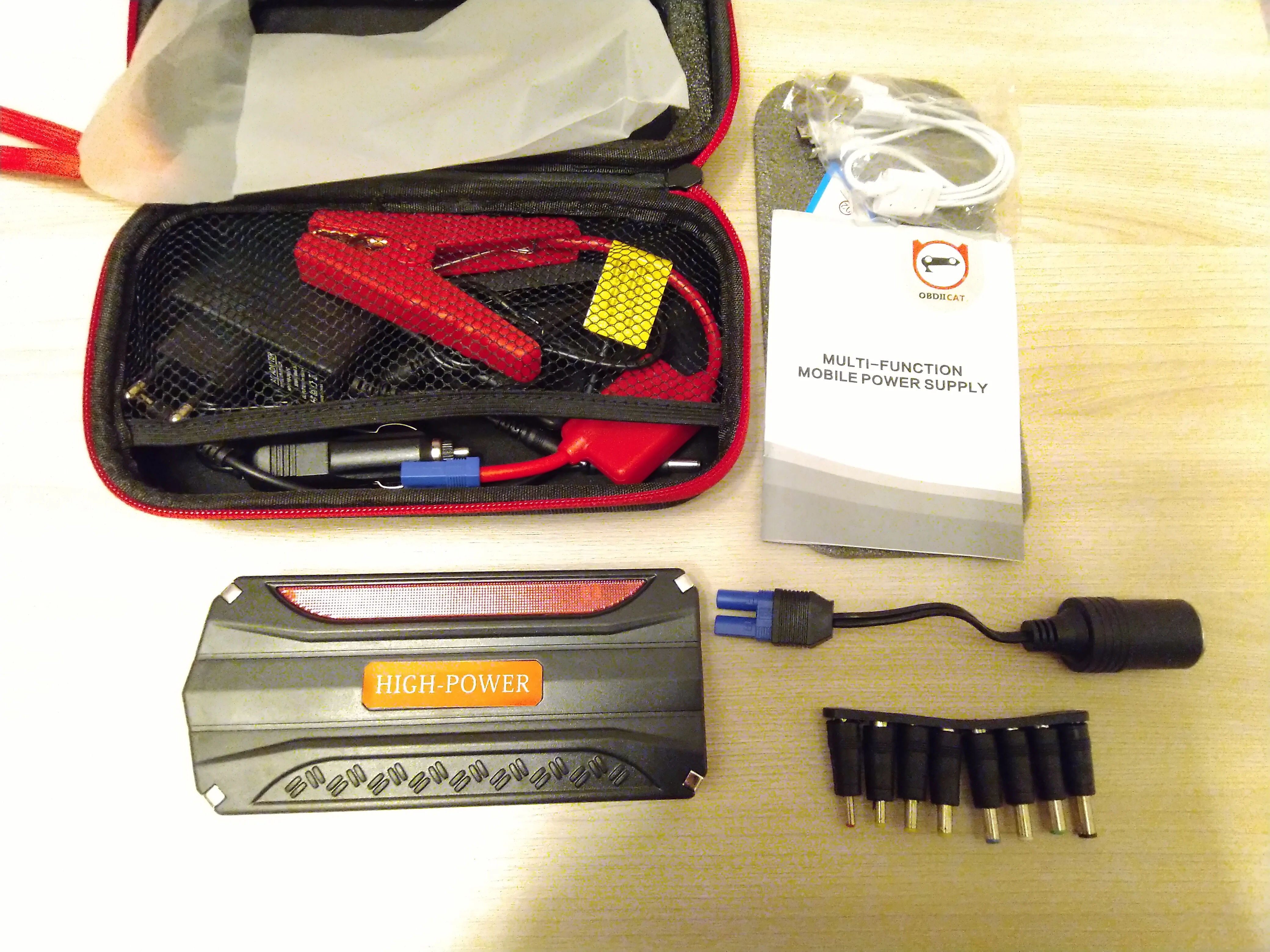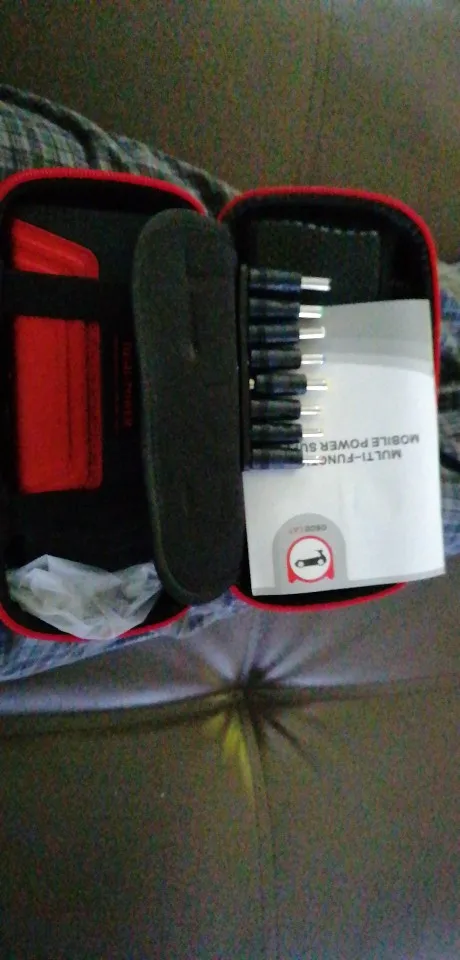 Доставка курьером, за 5 дней. Товар выглядит солидно. Упаковка - жесткий чехол на молнии. Внутри много проводов с разными разъемами, прищепки. Пока не пробовали заряжать.