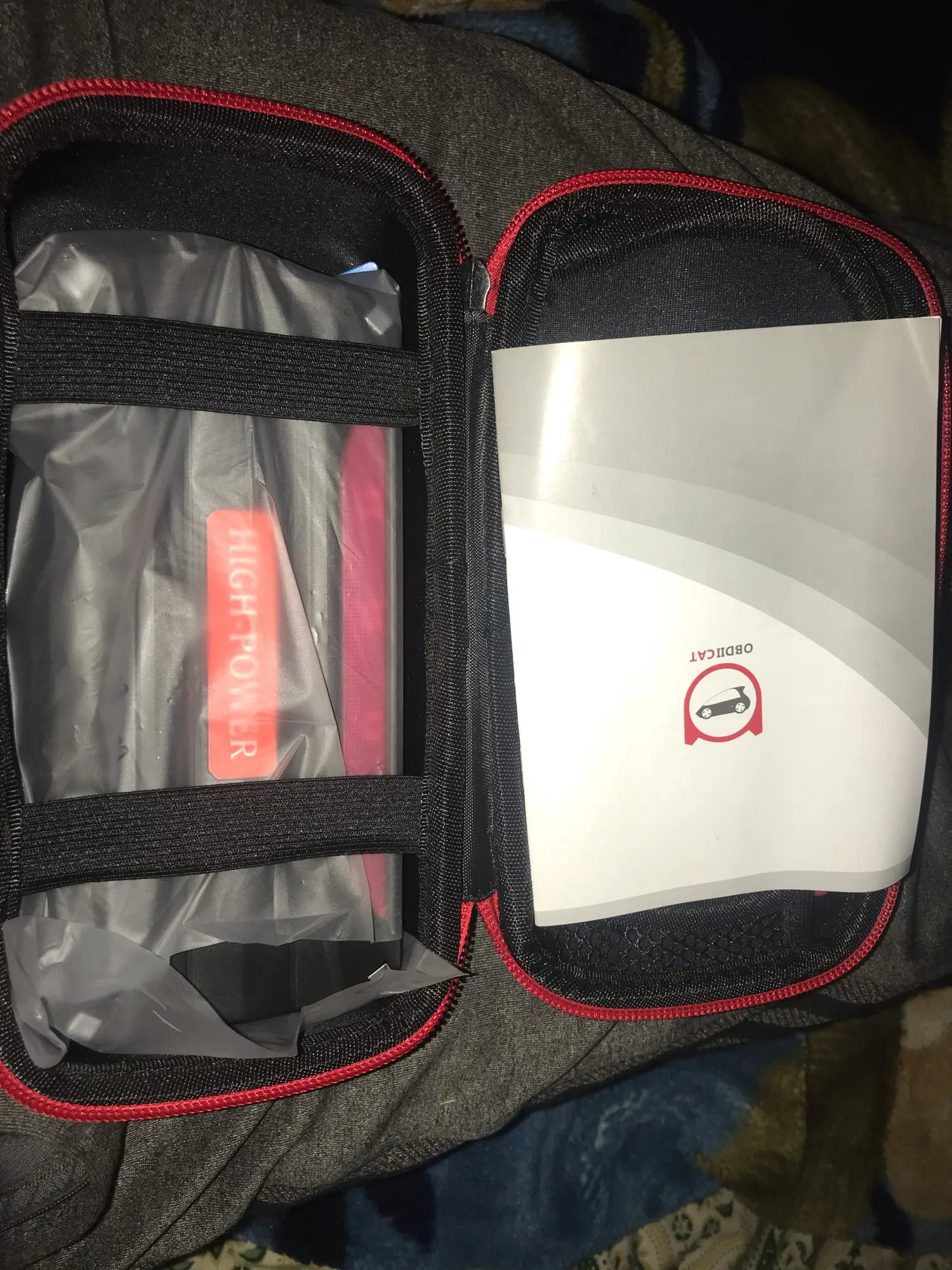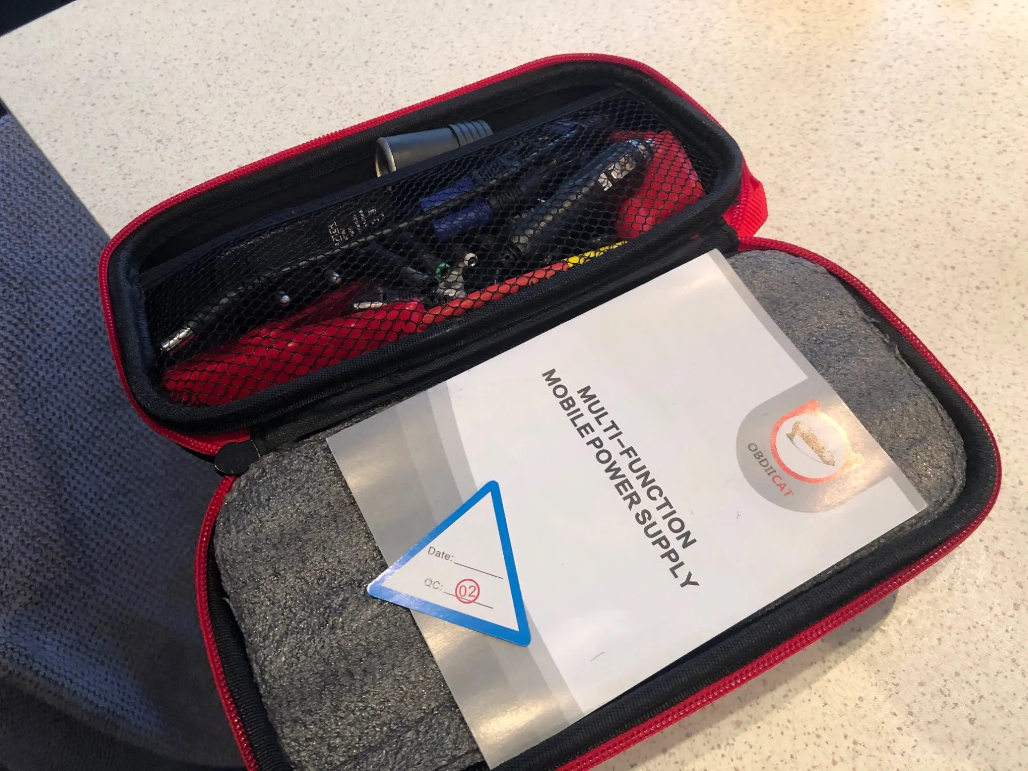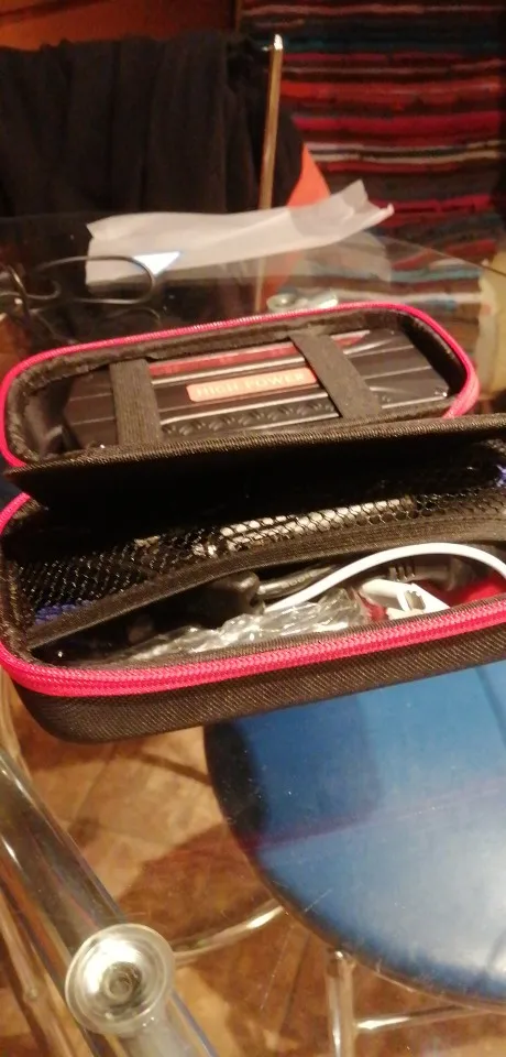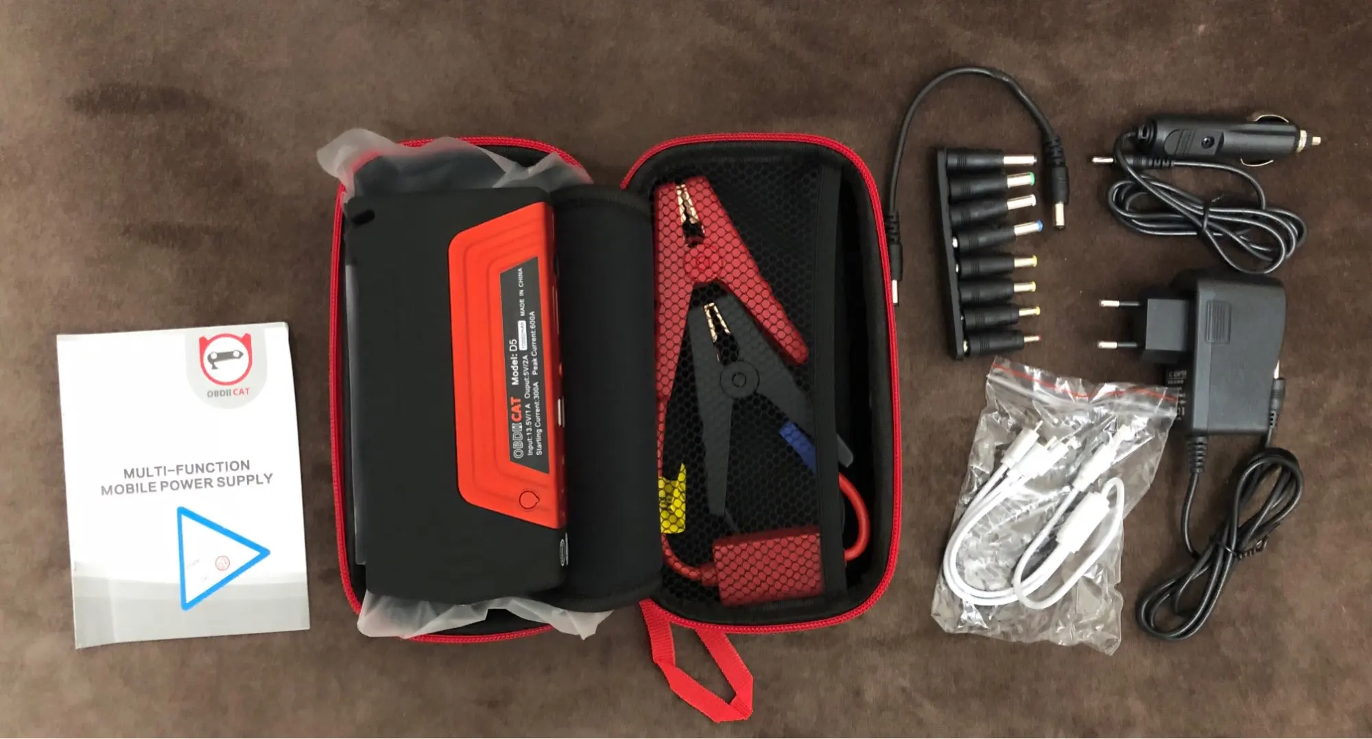 Доставка курьером, за 5 дней. Товар выглядит солидно. Упаковка - жесткий чехол на молнии. Внутри много проводов с разными разъемами, прищепки. Пока не пробовали заряжать.