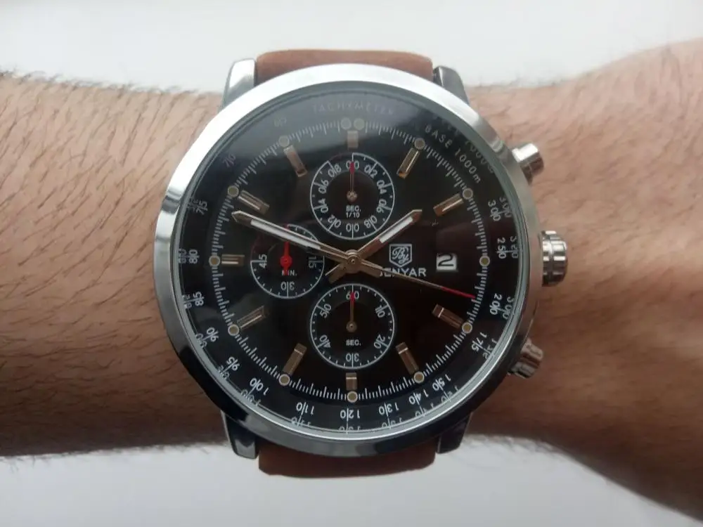 заказ дошел за 2 недели, часы пока работают, суточный ход около секунды. секундомер работает, точность 0.1секкнды. упакован товар плохо коробка была сразу в пакете, так что углы повреждены - для приличного подарка не подойдёт. реальный диаметр 43,8 мм- это максимум на тонкую руку. в темноте ни стрелки ни цифры не светятся.