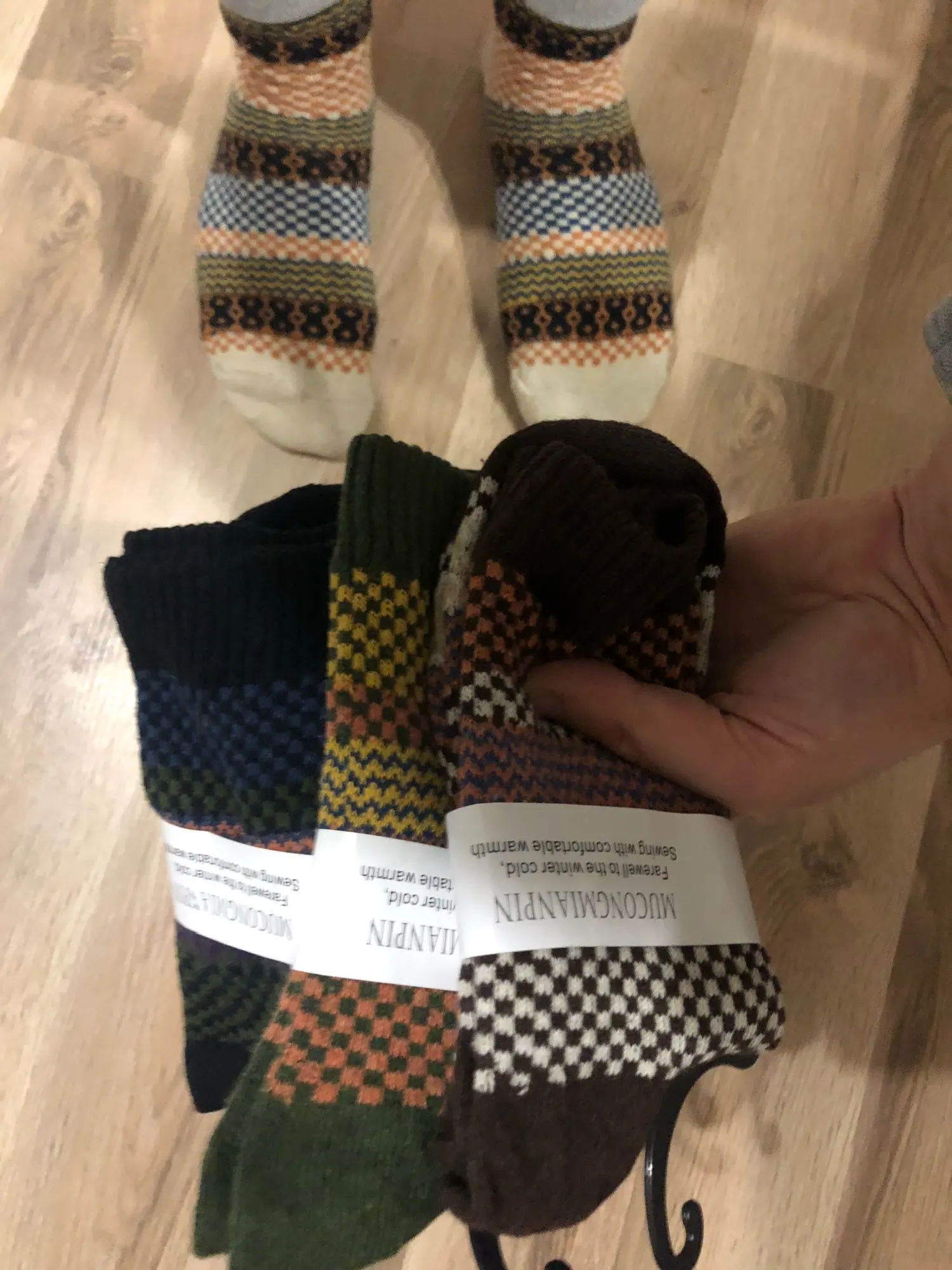Носки доставляются заранее. Они точно такие же, как на фотографиях, показанных продавцом, очень мягкие и теплые. Нет размера.