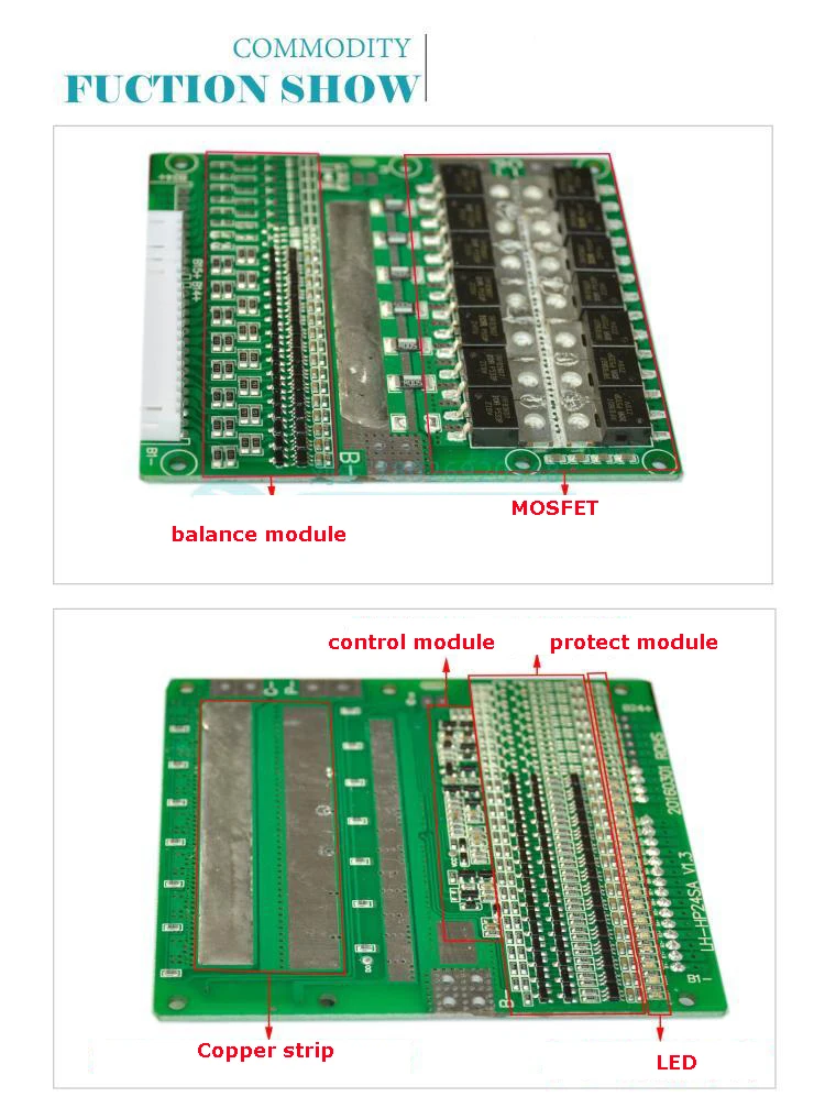 Последовательность подключения:Первая линия припоя B-к отрицательному аккумулятору, подключите баланс кабеля к аккумулятору (B1 B2. .. B16), вставьте кабель (розетку), после проверки, затем подключите P-/ C- line, затем посмотрите на количество общего напряжения батареи, если напряжение между P-и B + равно общему напряжению, он должен работать должным образом.