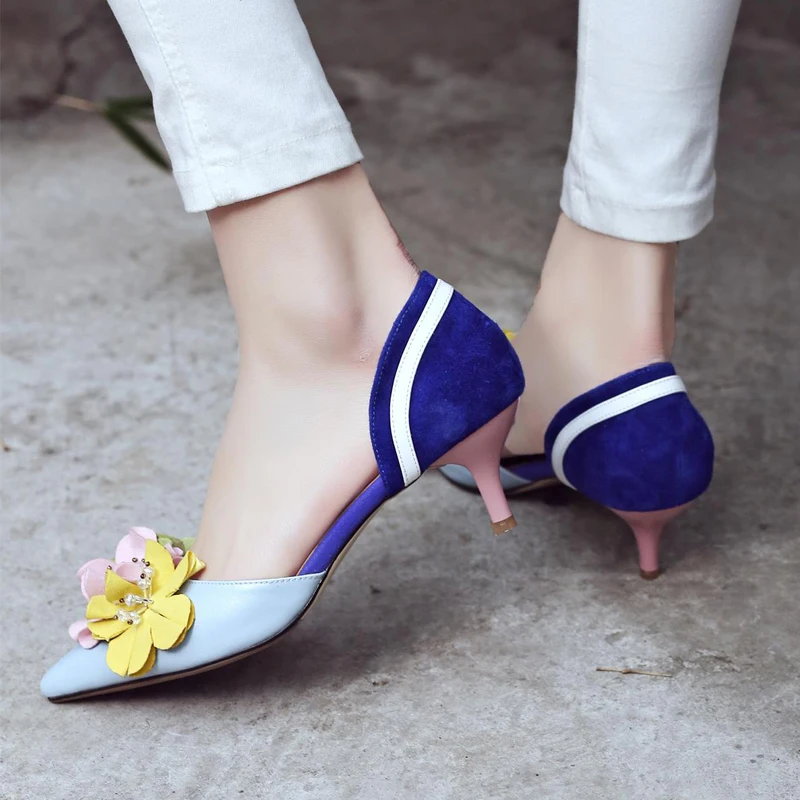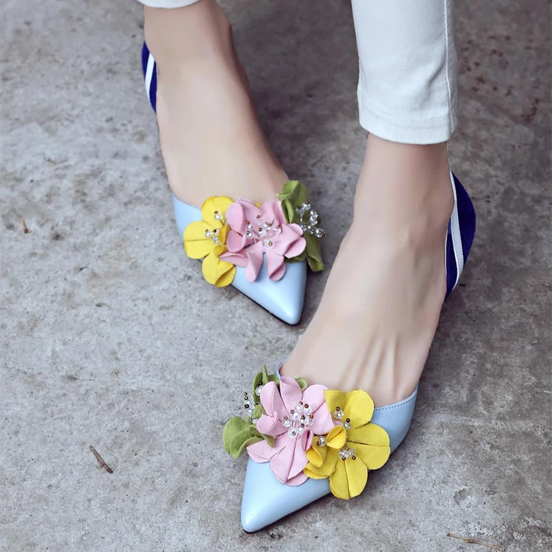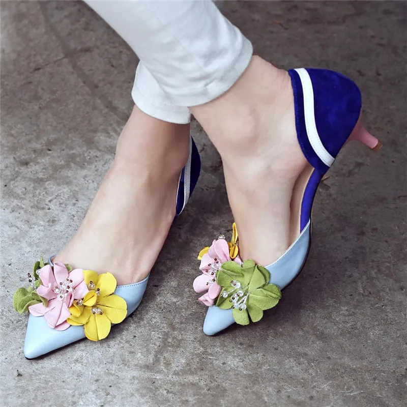 Туфли женские из искусственной кожи, на тонком высоком каблуке, с острым закрытым носком, с цветами, 2016