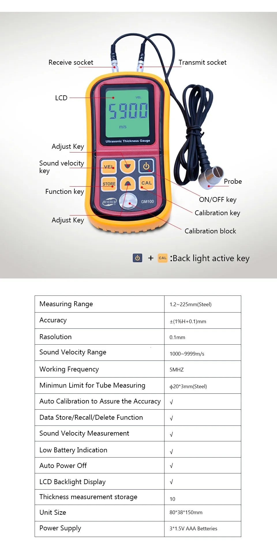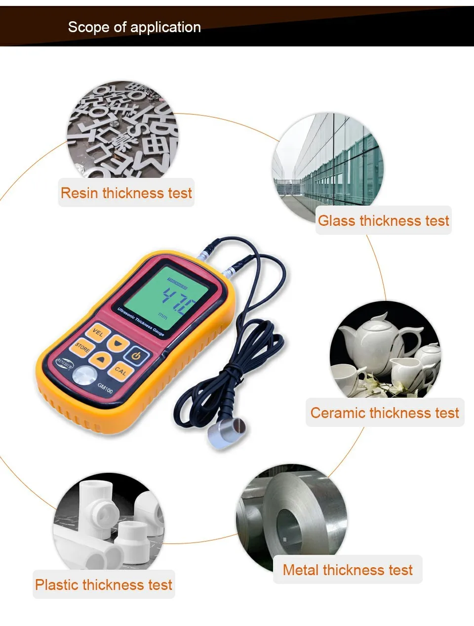 GM100 Ультразвуковой толщиномер прибор для измерения толщины металла толщиномер 1,2-225 мм (сталь) цифровой ЖК-дисплей измеритель скорости звука 0,1 мм разрешение