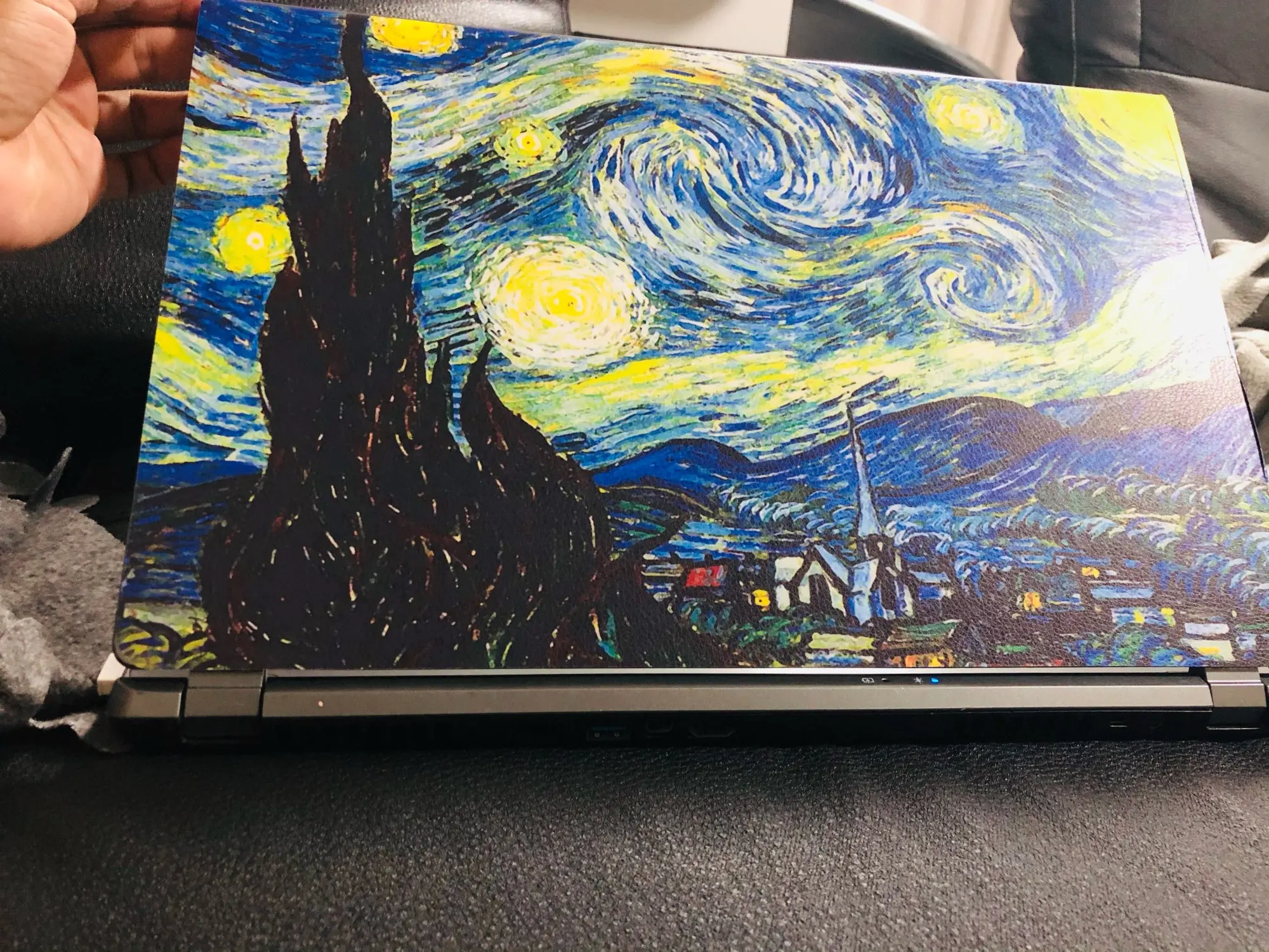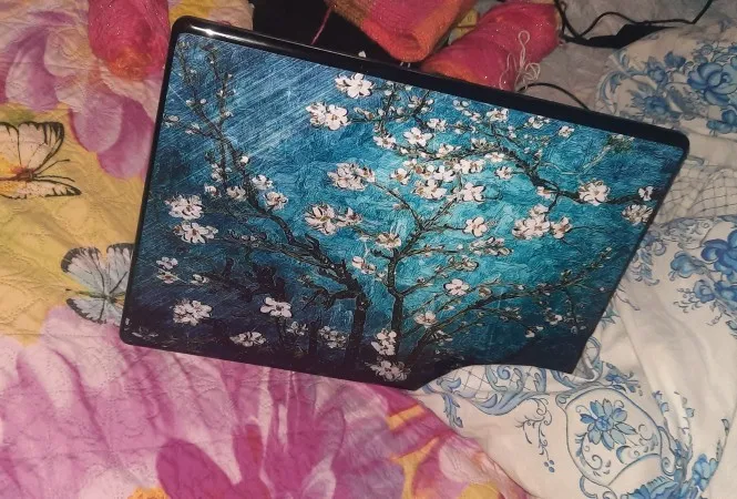 Был упакован по высшему разряду- в специальной жесткой упаковке чтобы не помнялась. В жизни выглядит интереснее, цвета глубже и насыщеннее. Также в комплект входит маленькая наклейка на области возле тачпада. Осталось только наклеить всю эту красоту