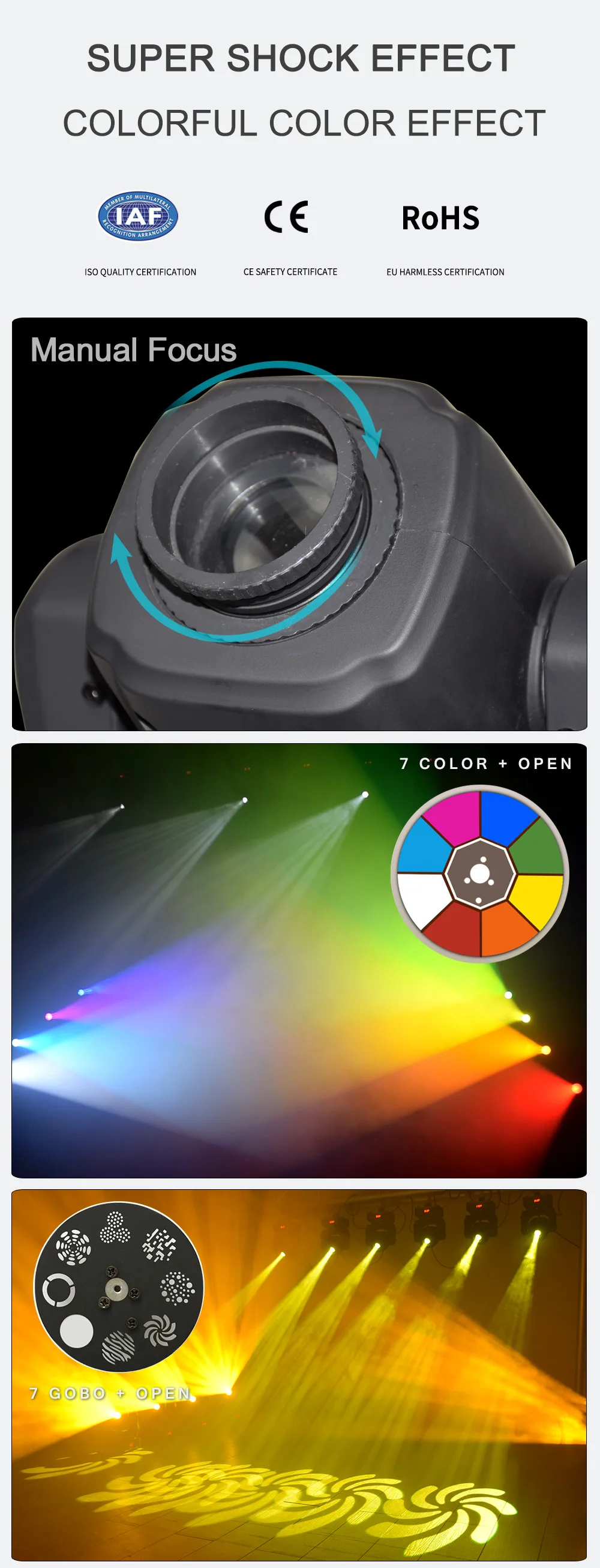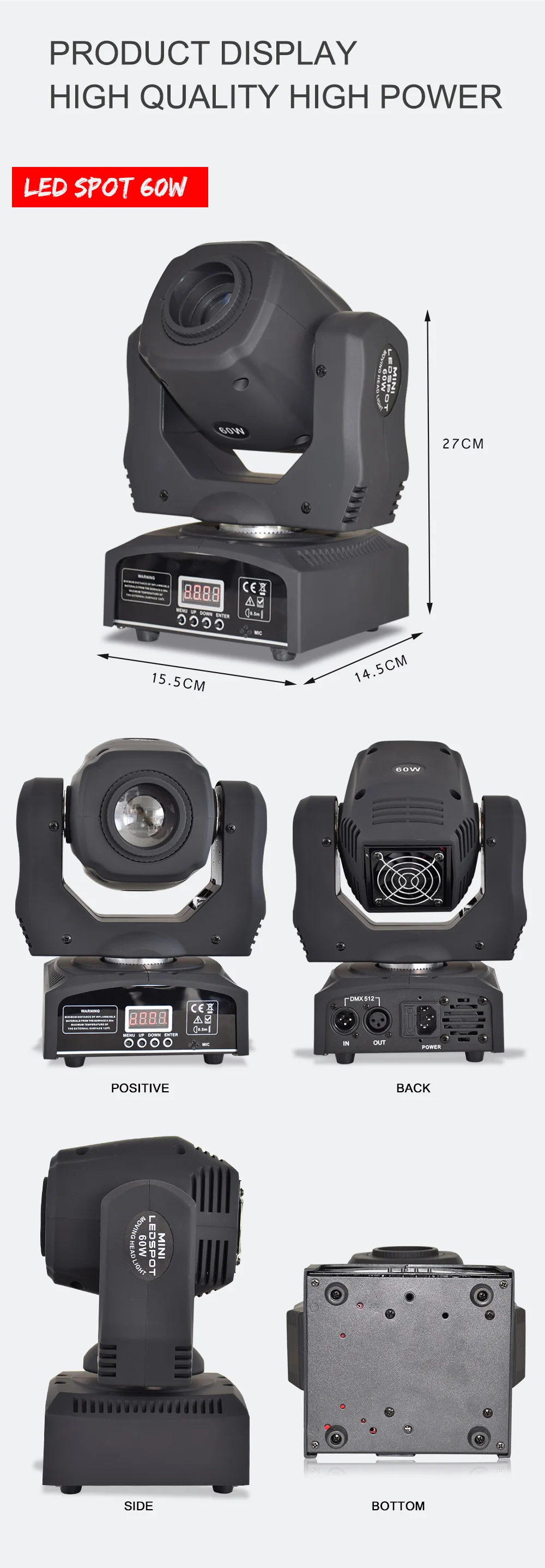 Входное напряжение: AC90--240V,50-60 Гц* Общая мощность: 90 Вт* Светодиодный источник: 60 Вт белый светодиодный высокое Мощность светодиодный s 60000 часов* DMX-Каналы управления: 9/11 DMX каналов* Цвета: 7 цветов + белый* Диммер: 0-100% механический диммер* Цветовое колесо: 8 цветов цвет s + половинный эффект цвета + скорость вращения цвета. Бесконечное вращениеКолесо Gobo: 8 gobos + shake + скорость вращения Gobo. Бесконечное вращение* Фокус: ручной фокус* Режимы работы: DMX512, автоматический запуск, звуковое действие, стробоскоп, автономный и мастер/раб, с богатыми передовыми встроенными программами.* Контрольный сигнал: международный стандарт DMX512* Внешний вид: высокотермостойкий пластик + литейный сплав* Цвет корпуса лампы: черный* Уровень защиты: IP20* Панорамирование/наклон: 540/180 градусов* Штепсельная вилка: чтобы отправить вам для удовлетворения требований штепсельной вилки, штепсельной вилки ЕС, штепсельной вилки США, штепсельной вилки Австралии, штепсельной вилки Великобритании и так далее.* Использование помещений: сцены, ночные клубы, дискотеки, отели, магазины, семейная вечеринка на день рождения, подходит для ди-джеев и т. Д.